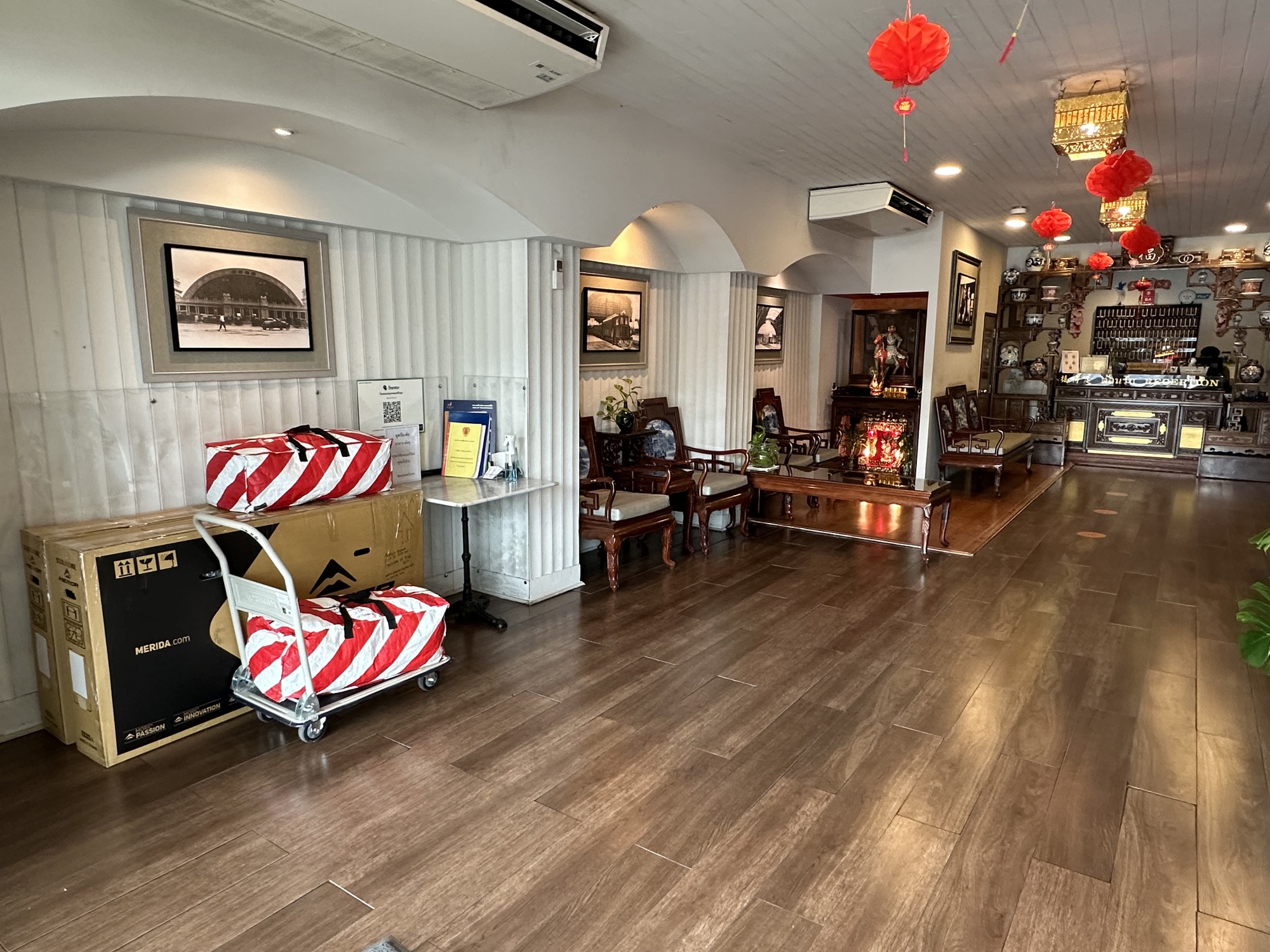 At ten we headed to the lobby to see what was what. You know what? The traffic was still virtually at a standstill. It’s a one-way street out there, there are no alternative routes. Looks like we may be leaving later than optimal. There are a multitude of steps on a long flight itinerary with bicycles that I’d been thinking about for a couple of weeks, so this was just going to be stressor number 458 out of a thousand others, waiting for our ride to show up and get us to the airport with enough time to check in, go through security, go through immigration, and sneer past a hundred stupid luxury goods shops to our departure gate.