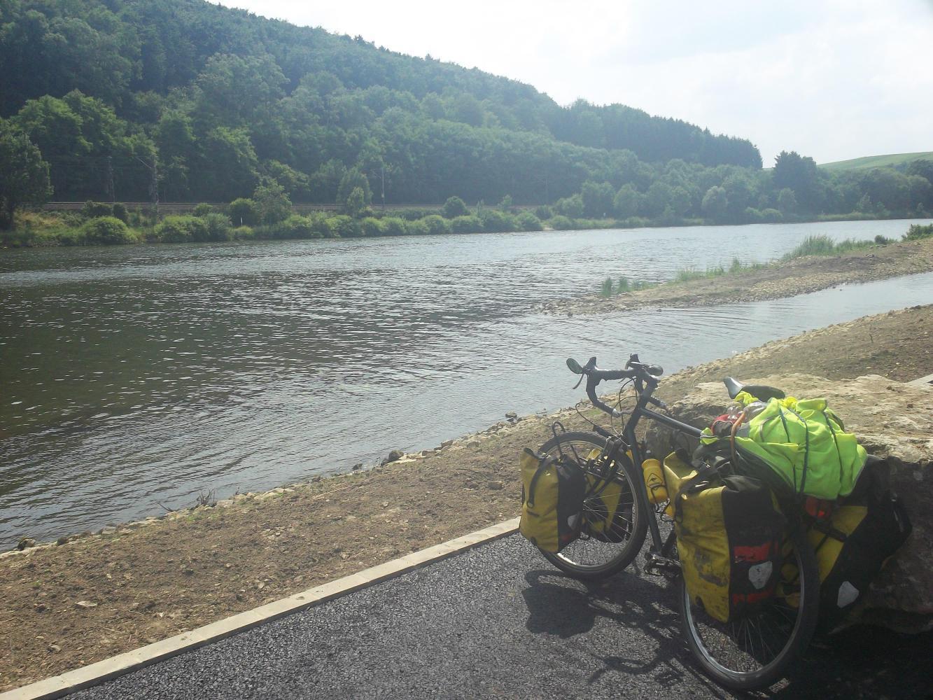 I followed the river through the valley south east out of the city before a steep climb took me up and away and I rode east on quiet roads until I reached the river Mosel, which marked the border with Germany. It had been very hot and sunny since I had begun from Paris, with the mercury consistently above thirty degrees. Some of the roads in France had even been melting, although I think that's mostly because the French can't build roads. Upon reaching the Mosel I celebrated by jumping right in it to cool off. I was considering swimming over to Germany when a big cargo ship came sailing down the middle of the river and I reconsidered. I followed the Mosel north on the Luxembourg side until the river turned east and there was no more Luxembourg left. A shame really.