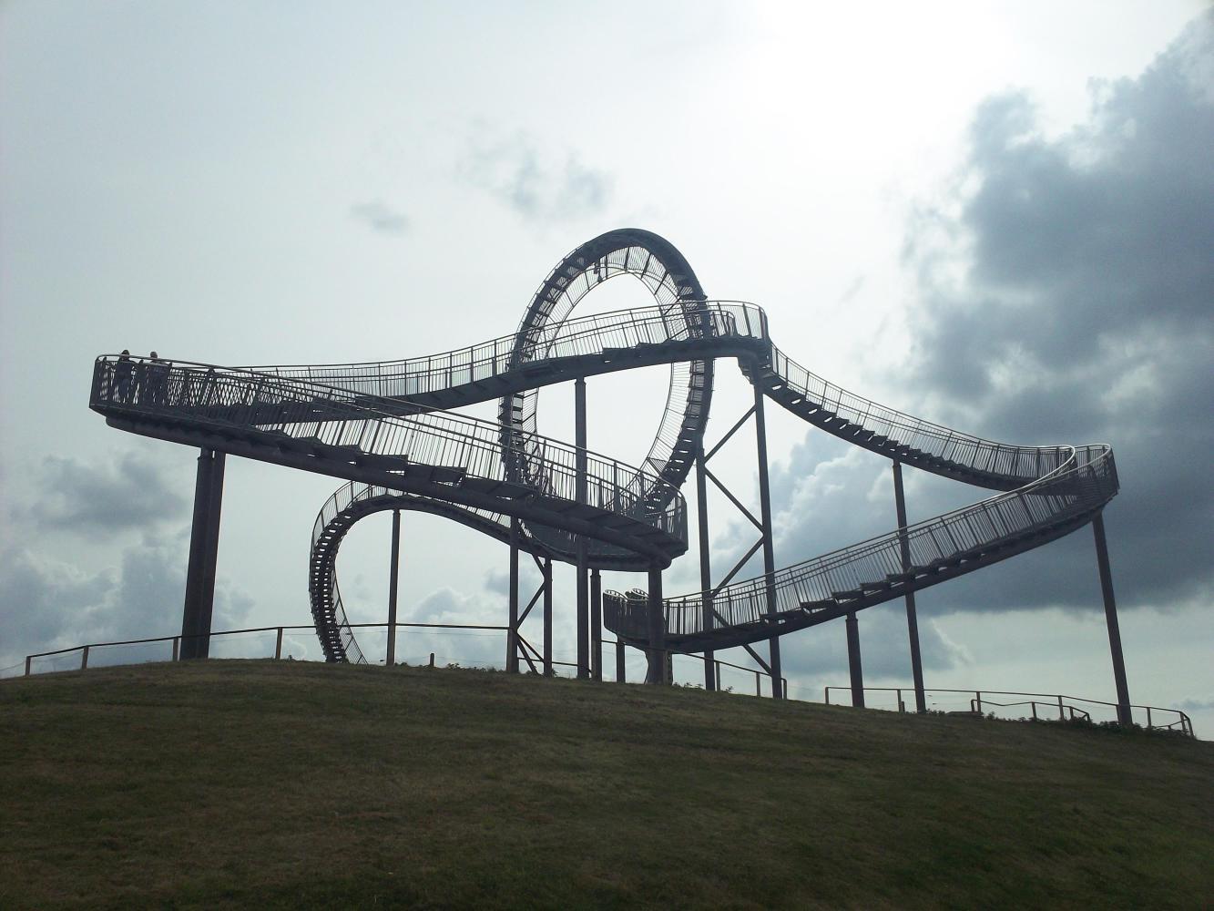The hill itself was unusual because the landscape by now was generally very flat, and it turned out that it was a pile of waste from a zinc works that had been 'greened'. On the top, a giant sculpture 'The Tiger and Turtle' was indeed in the shape of a roller coaster but with steps that you could walk all around. Unfortunately, the loop part was closed because you couldn't walk around that without falling down and suffering serious injuries. But walking around the rest of it was really cool.