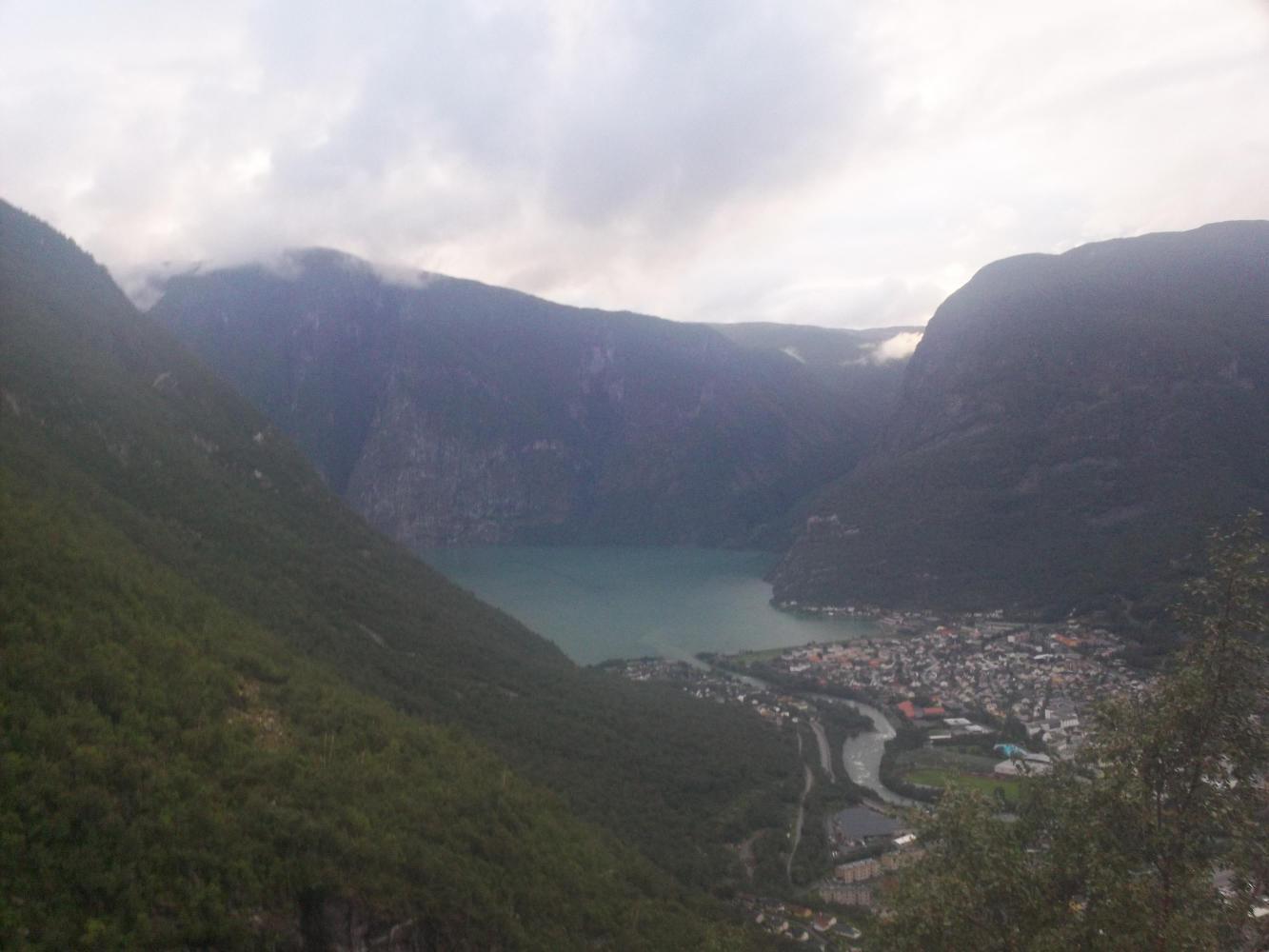But then I got down below the rain and began to enjoy it. The road was steep and I could go really fast and it was super fun. I could see the town of Øvre Årdal below me and it looked very scenic situated as it is next to a big lake. The lake is slightly above sea level, with a short river connecting it to Sognefjord, but it looked like it was a fjord itself buried among the mountains.