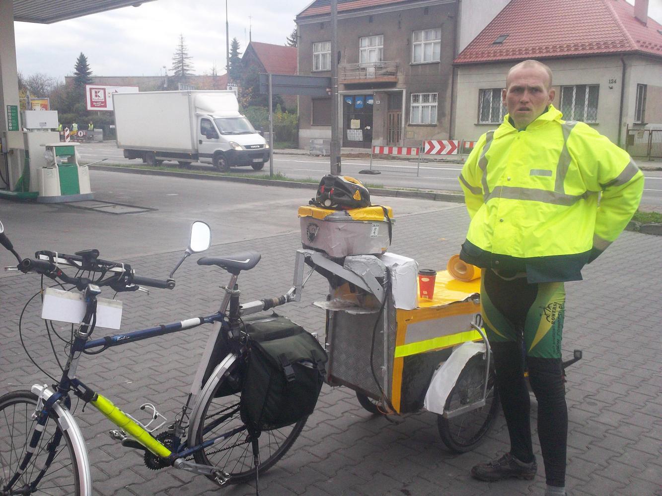 The last day into Krakow was terrible with a strong crosswind and lashing rain. It was a real battle to make it to the city on time, but it was worth it because I had a 'warmshowers' host by the name of Patryk to get to. So I battled my way through and into the outskirts of the city, where I saw a very highly visible man standing near a gas station. He was also standing with a touring bike of some sort, which had a very highly-visible trailer attached to it, and he waved me over to him.
