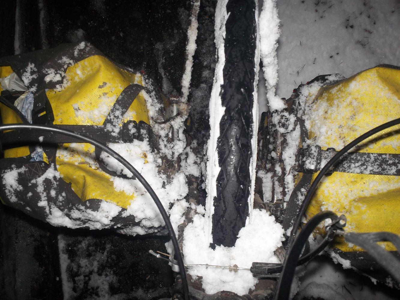 The route temporarily returned to asphalt, much to my relief, then took another dirt track through the woods. This was nowhere near as bad as the first and I saw several white-tailed deer, that were well disguised by the snow. I was evidently now into an area where there had been a heavier snowfall as there was still plenty around. It would have been nice to camp in these woods as it was almost sunset, but I wasn't close enough to Budapest yet and so I carried on for a while after dark, passing through the town of Komarno. Because of the extra snow here, the bike path beyond Komarno became quite treacherous as the temperature dropped and ice formed once more. It was really quite bad for a while and I skidded often, remembering each time to resist the natural temptation to brake and instead controlling the skid into the snowy grass at the side of the path. Much of the time it was actually safer to cycle in this snow. I should have liked to camp but there really wasn't anywhere, sandwiched as I was between a main road and a railway. Then a man came along the path on a little tractor thing, spreading grit behind him, which was really rather awesome of him because after that it wasn't slippery anymore and cycling was easy. I decided to do a bit more distance and make the most of the freshly gritted path but once the bicycle route turned off the main road on some smaller road I found some trees and settled in for the night, being very careful to peg my tent out properly!