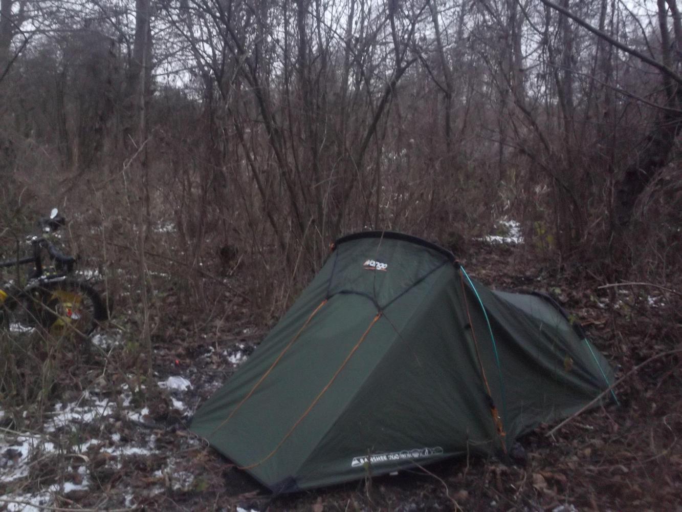 When nightfall came I had terrible pains finding anywhere to camp because it was all fields and no forest and I cycled on in the dark for a long time until I was almost back in Slovakia. Then I found a really great spot where an icy side road led to some trees and things. There was a little snow on the ground but it was an ideal spot, and I settled in for the night.