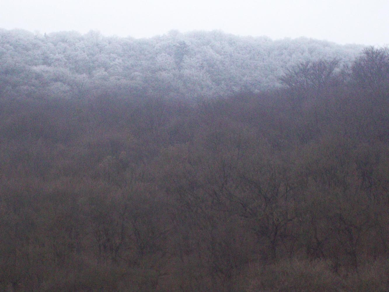 I could see that there was a patch of woodland about ten kilometres out of the city along the way that I needed to go, and it looked like a great place to camp (as long as no hunters came.) But google maps is not three dimensional and as I neared the woodland the road began to climb steeply up. It kept going up like this into the woods until the lights of the city were way below me and I was up among the white trees with snow on the ground. Even in the faint light I knew it was beautiful and when it finally flattened out at the top there was an area that was perfect for camping and I decided to spend the night up high.