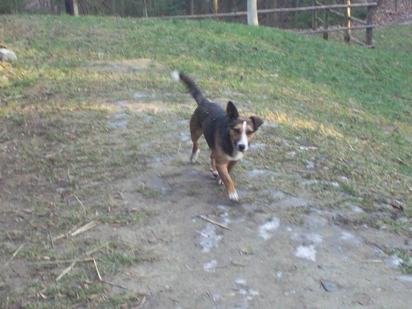 Now we really felt we had to get away from the dog before he became too attached and so we tried running away. When Harvey was distracted in the woods we ran as fast as we could down the path and for a moment it seemed we might be able to lose him. But then I looked back and saw him bounding after us, a tongue panting, ear flopping, bundle of love and energy. And he could certainly run a lot faster than we could.