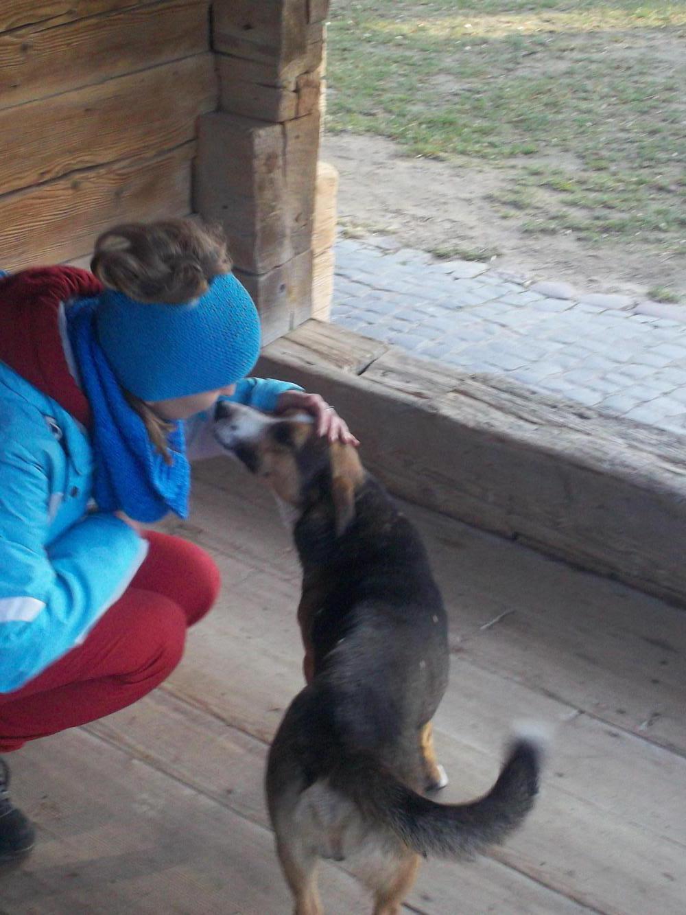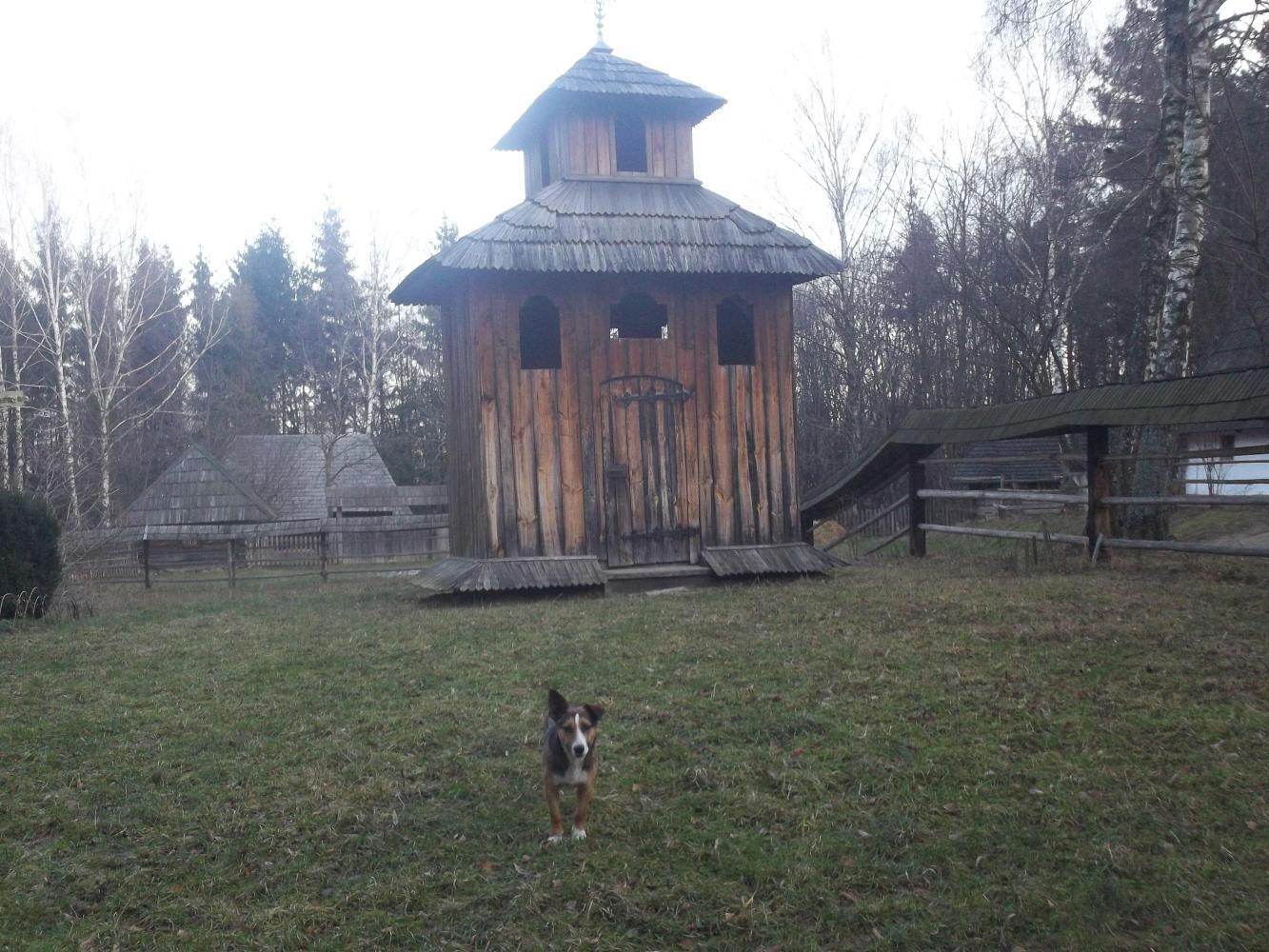 On Boxing Day Hanna and I went for a walk to a big park which was home to a museum of traditional Ukrainian architecture. All through the park there were old wooden buildings which had been brought here from all over the country. Almost as soon as we arrived at the park a lovely dog (played by Tramp from 'Lady and the Tramp') came bounding over to us to say hello. He jumped up and I grabbed him by his front paws and did a little dance with him and Hanna petted him and fussed over him. He was an implausably cute dog with one floppy ear and the other sticking up. At first we thought he belonged to someone else but it soon became apparant that he was a stray and he began to follow us as we started walking among the wooden buildings. As a bit of fun I named him Harvey (I've always wanted a pet dog called Harvey) and we encouraged him for a bit to come with us and explore the park.