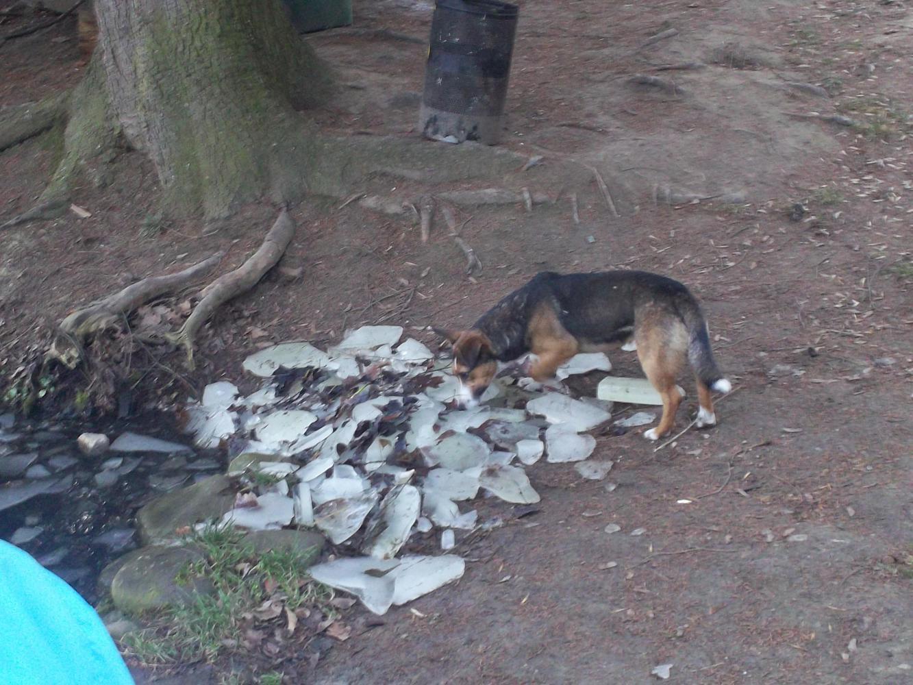 We walked past a frozen lake and Harvey seemed to be trying to find water so we took him around to a corner of the lake which was unfrozen and he drank happily. Then he started digging eagerly amongst a pile of frozen ice pieces beside the lake and pulled something out. He put it on the ground and leaned down and started rubbing his neck against it. When he stopped we saw what it was - a small dead fish. This was the point at which we realised we had one weird-ass dog on our hands.