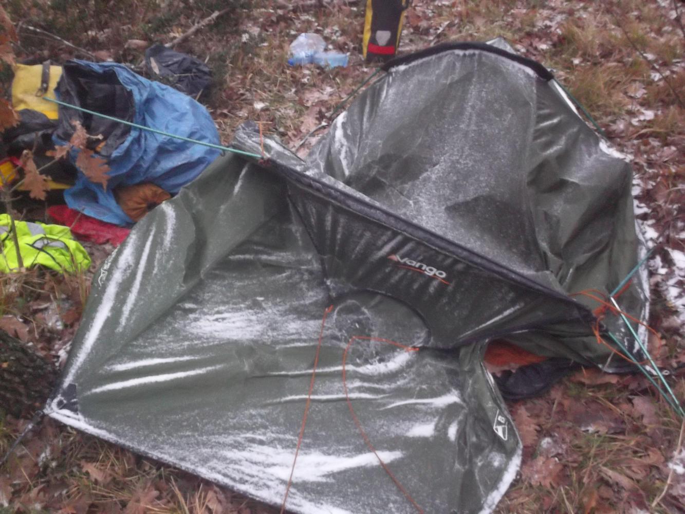 The rain continued for most of the night, but I was delighted with how well my tent coped with it thanks to the newly installed drainage hole. I should really work for a tent-designing company. In the last few hours before dawn the rain stopped and the temperatures plummeted to below freezing. This combination of heavy rain followed by such immense cold proved to be, how can I put this politely, a complete ducking fisaster. I climbed out of the tent into light snow and tried to disassemble it, a necessary step prior to cycling off. Unfortunately, the water which had run into everything had rather annoyingly frozen solid. The poles were frozen together, the poles were frozen to the tent fabric, the pegs were frozen to the ground, the tent was frozen to the pegs, the pegs were frozen to my hand, and my hand was just frozen. It took me the best part of an hour rubbing and breathing on everything to get the tent down and put away, with just the one pole snapped in the process.