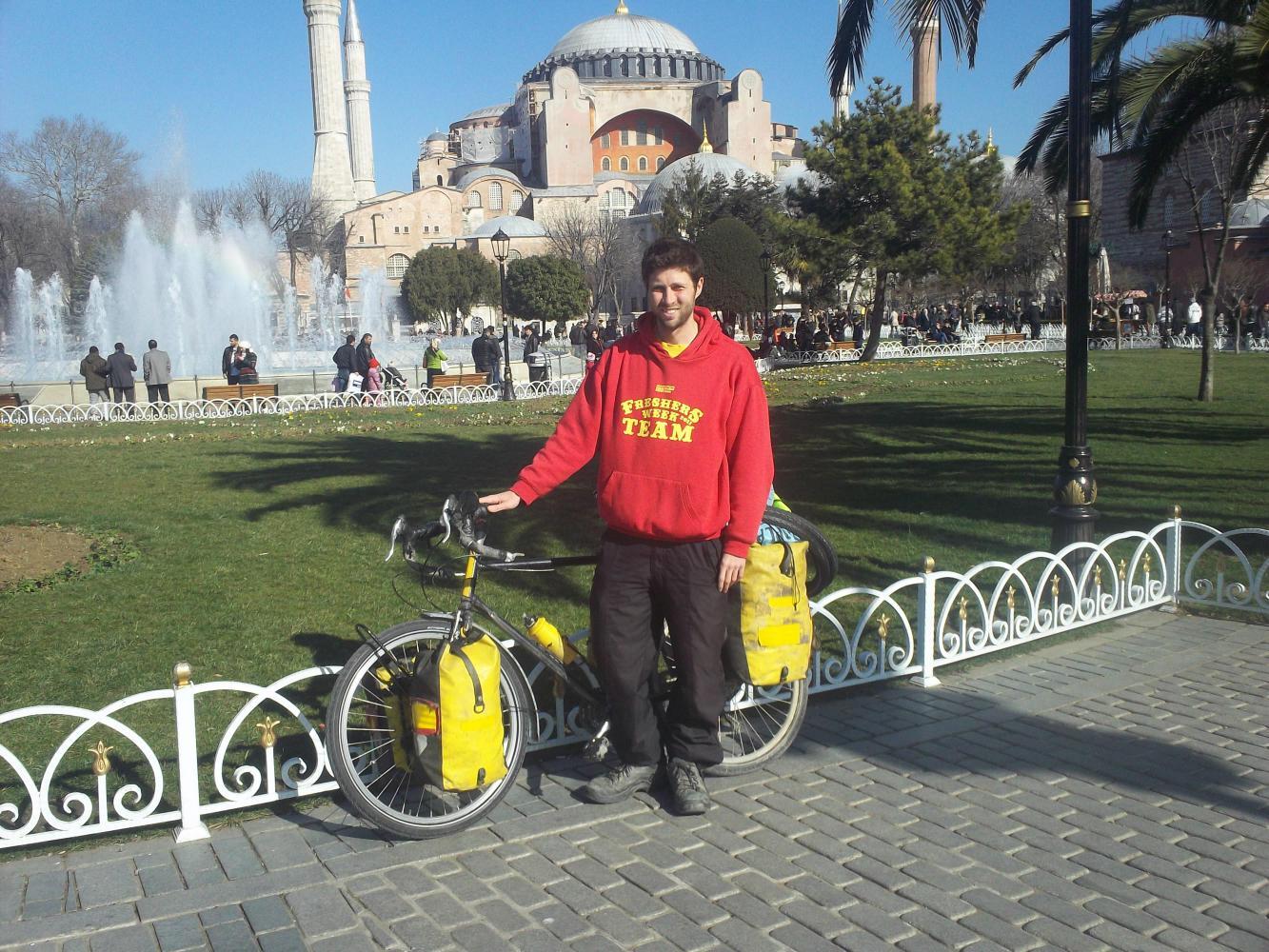 Taking one of these painkillers before I began my next journey across town to a hostel turned out to be a very good move. The drug was so strong I soon began to feel like I was floating on air as I made my way through the Istanbul streets. It was also sunny for the first time in ages, and Istanbul looked utterly amazing. I was trying to concentrate on weaving my bike through the chaos of people on the sidewalk (rather than the chaos of vehicles in the road) but I wasn't too distracted to notice that Istanbul was clearly one of the world's great cities. I stopped to pose for a photo in front of the Hagia Sophia which was very close to my hostel in the heart of the old town.