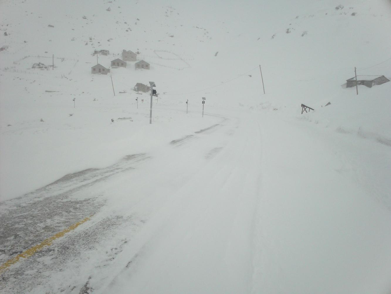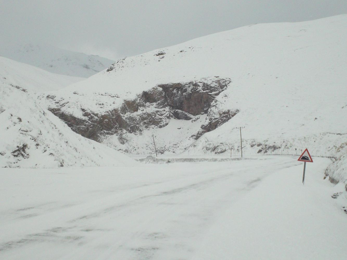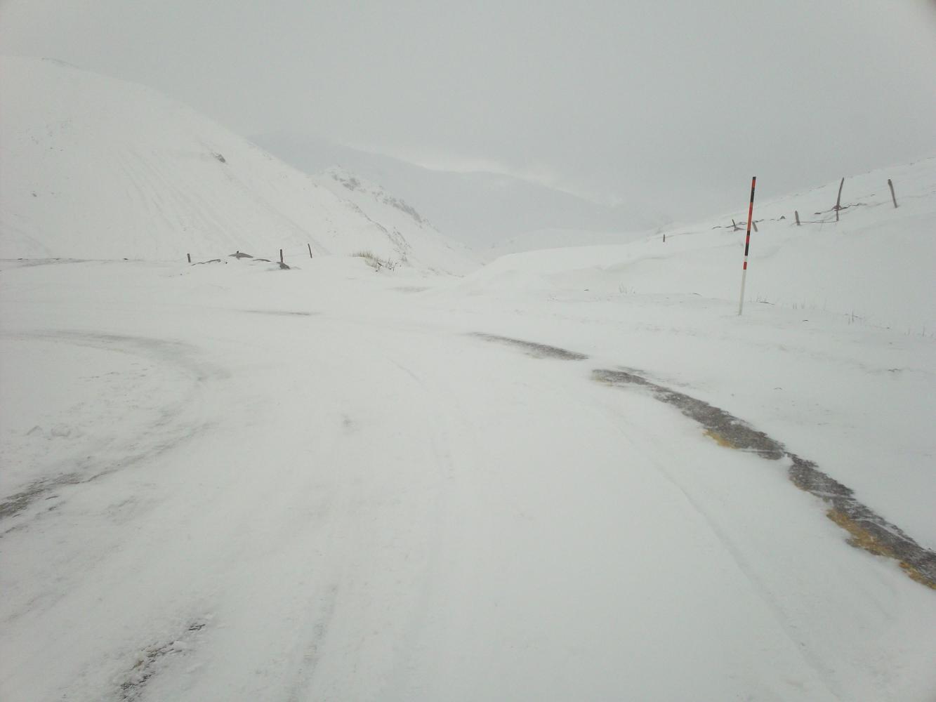 I was worried that I was going to get completely snowed in on this mountain pass but after breakfast I went back upstairs and saw that the snow had stopped and the wind had died down. The car that had been stuck was gone and then I watched as another car drove over the top of the pass too, from the direction that I needed to go. Clearly it was possible to get through and with the snow stopped, now was the time to make a break for it.