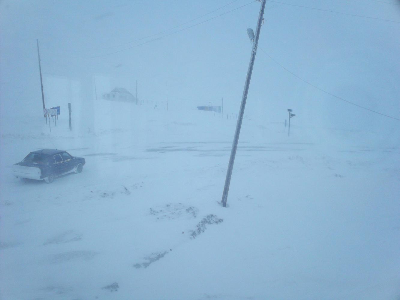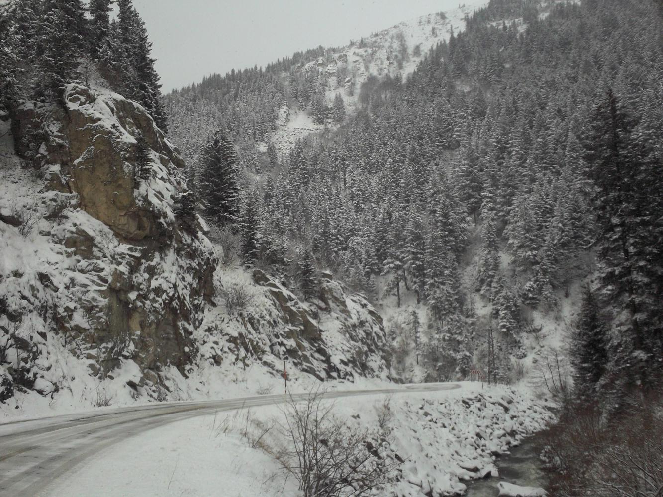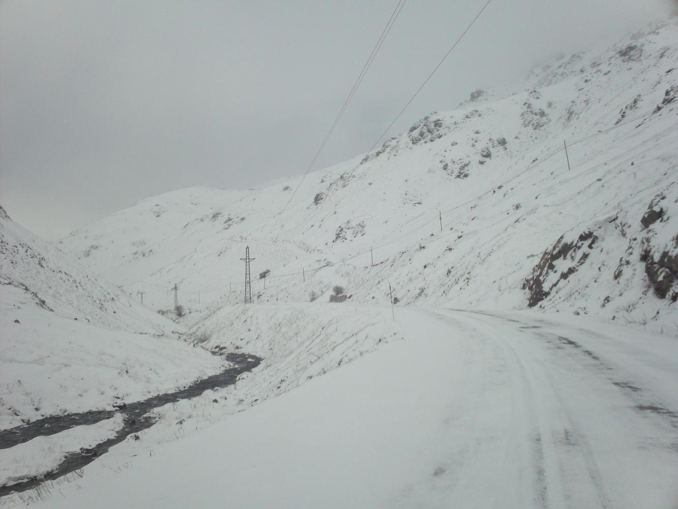 I was worried that I was going to get completely snowed in on this mountain pass but after breakfast I went back upstairs and saw that the snow had stopped and the wind had died down. The car that had been stuck was gone and then I watched as another car drove over the top of the pass too, from the direction that I needed to go. Clearly it was possible to get through and with the snow stopped, now was the time to make a break for it.