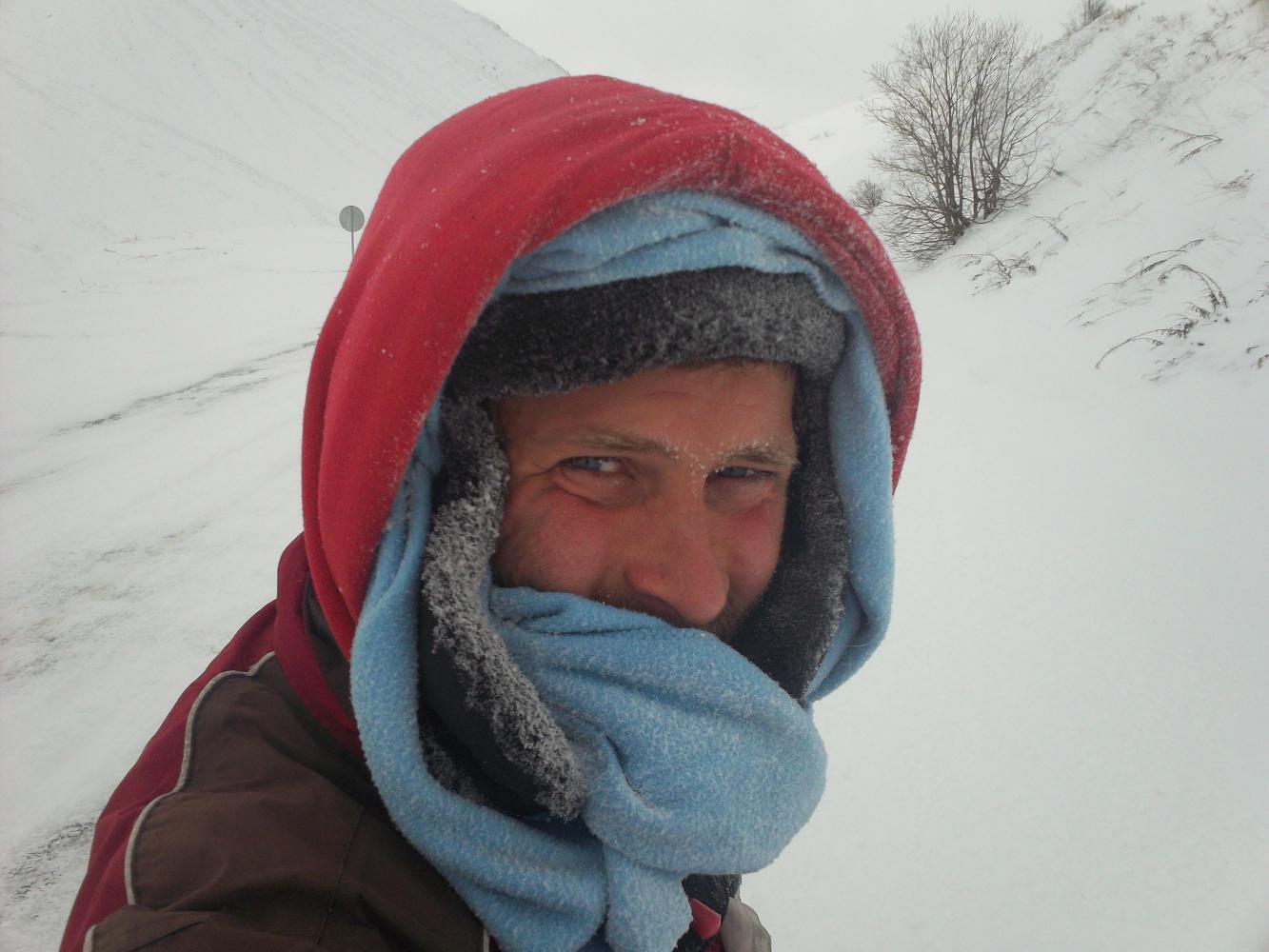 The Jandarmas left me to it and I was very relieved that I had left the summit when I did, and that I made it down just far enough. I don't like to think about what might have happened had they met me higher up the mountain. In any case I could now relax and enjoy the scenery as, while the road was clear, the surroundings were still heavily blanketed in snow. I stopped at a little rest area where there was a mosque and a few houses and a dog came running over to me. I fed him a lot of food as I thought he looked cold, and named him Beachball.