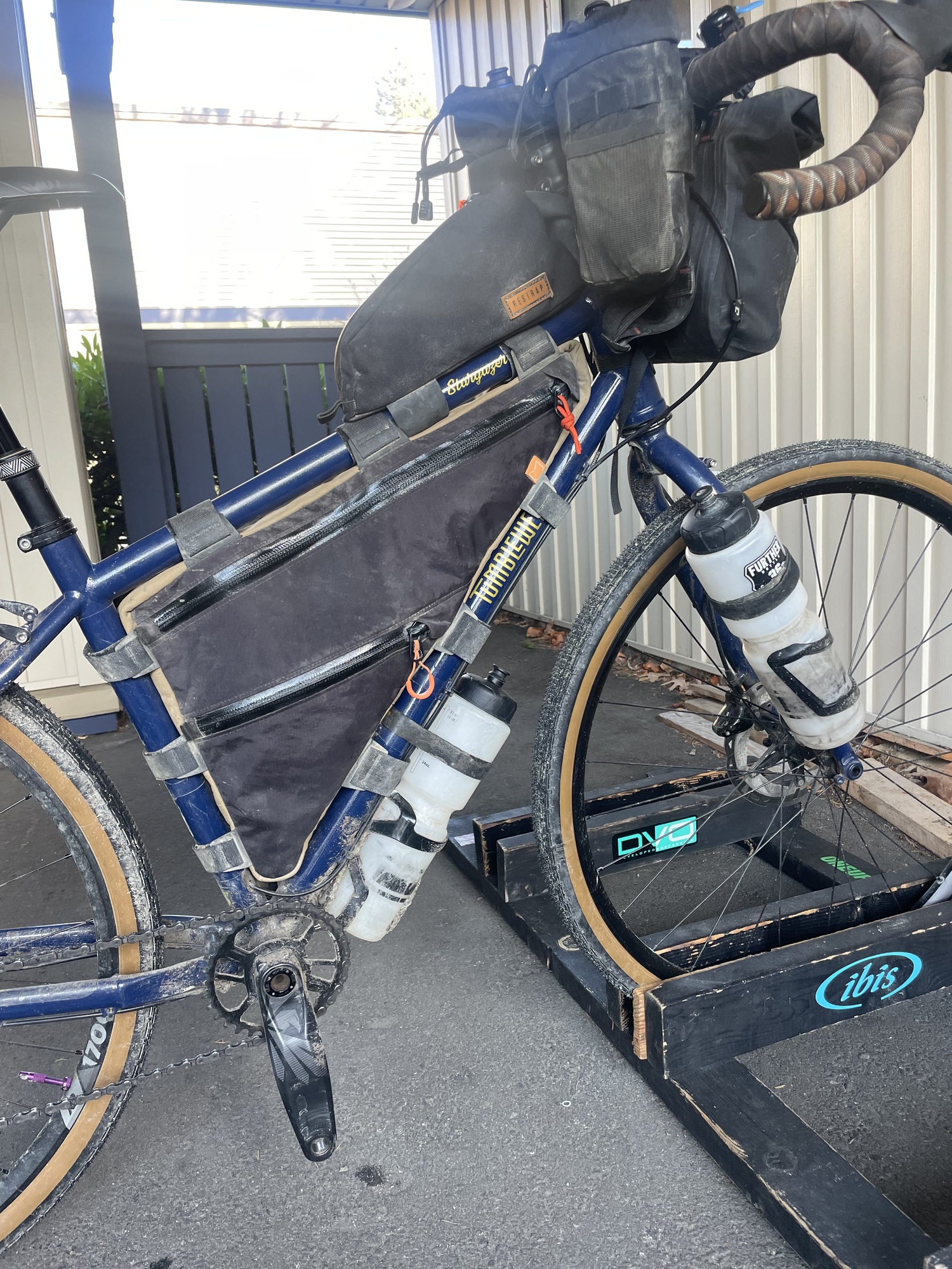 On the front of the bike I'll have my usual utility bag, and one bottle cage for carrying a 1 L water bottle on the fork.
