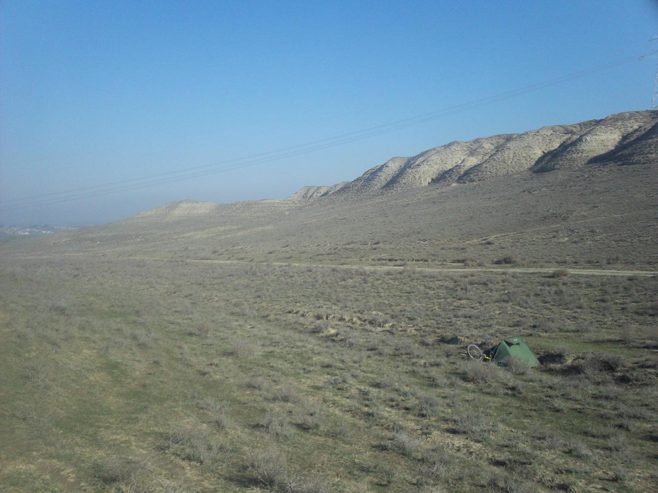 Azerbaijan felt so safe that I didn't feel the need to pack up too quickly in the morning and allowed myself a lie-in in my tent which, in any case, was in a field away from sight. After I had eventually gathered the energy to get up I was about to wheel my way back to the main road when a tremendous flock of sheep came marching over the hillside towards me. It must have been a hundred strong and I was glad that I was up and out of the way just in time. Bringing up the rear was a single shepherd, a young man in a woolen hat who naturally came over to say hello. We spoke for a few minutes and as usual I had no idea what he was saying, but it was nevertheless a wonderful way to start the morning. Here I was standing with a shepherd boy, stave in one hand, horse held by the reins in the other as his flock wandered the grassy hills behind. It was a timeless moment, a scene that would have looked just exactly the same had it occurred a hundred or a thousand years ago. Then his mobile phone rang and he stopped to take the call.