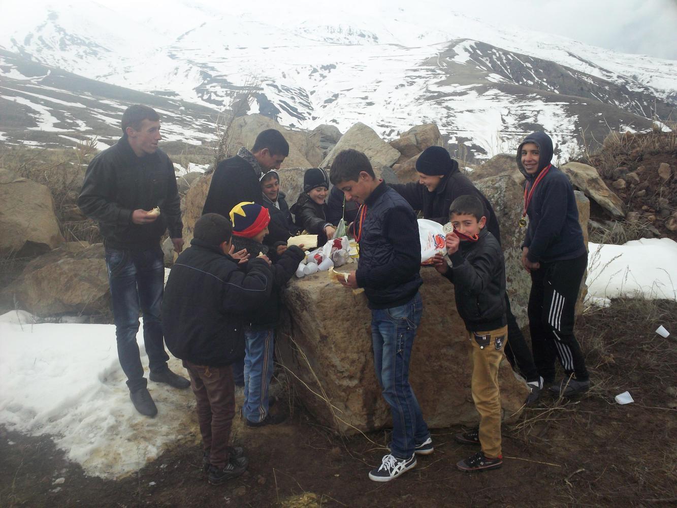 There was disappointingly no summit sign to mark what, according to my map, was the highest point of the trip so far at 2410 metres above sea level. The climb was not so tough though, because it had started at 1900m at Lake Sevan. The drop on the other side took me down much lower, a descent that went on and on through a rather annoying rainstorm. All the way down I was cursing at losing so much altitude, all of which would need to be regained for the next pass. I was consoled by a group of kids, a karate club that had chosen high on a snowy mountain pass as an unlikely location for a picnic. They were eating cheese sandwiches on a big rock and waved me over to join them. I maintained a safe distance, well aware of what a group of karate kids might do to me in such a remote location, and wished I still had that tyre lever. But they seemed friendly enough, and one brought me over a large white bread roll coated in a thick synthetic cheese paste. It tasted disgusting, but I ate it anyway, just to keep them happy.