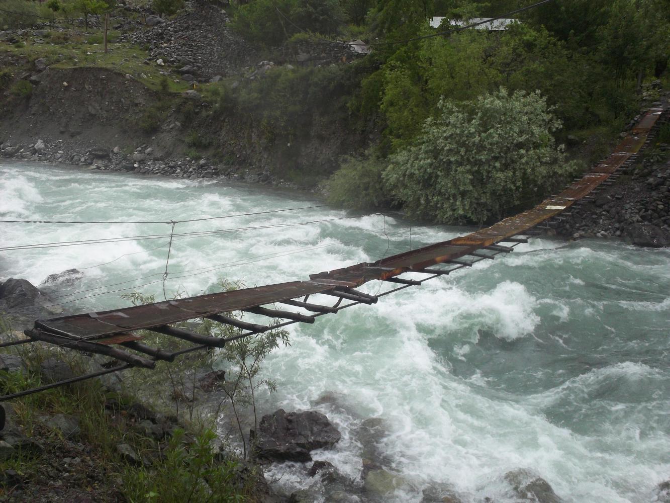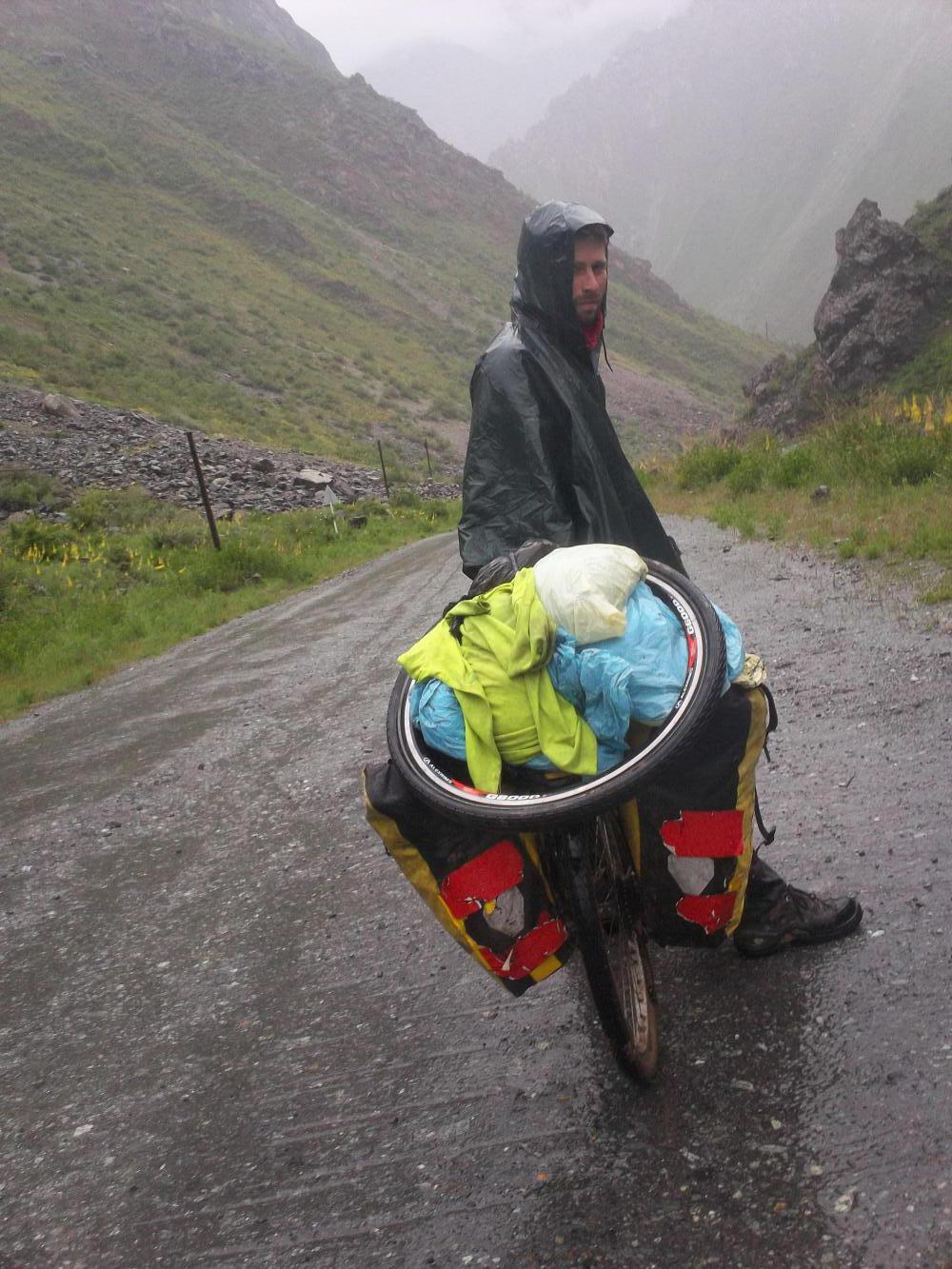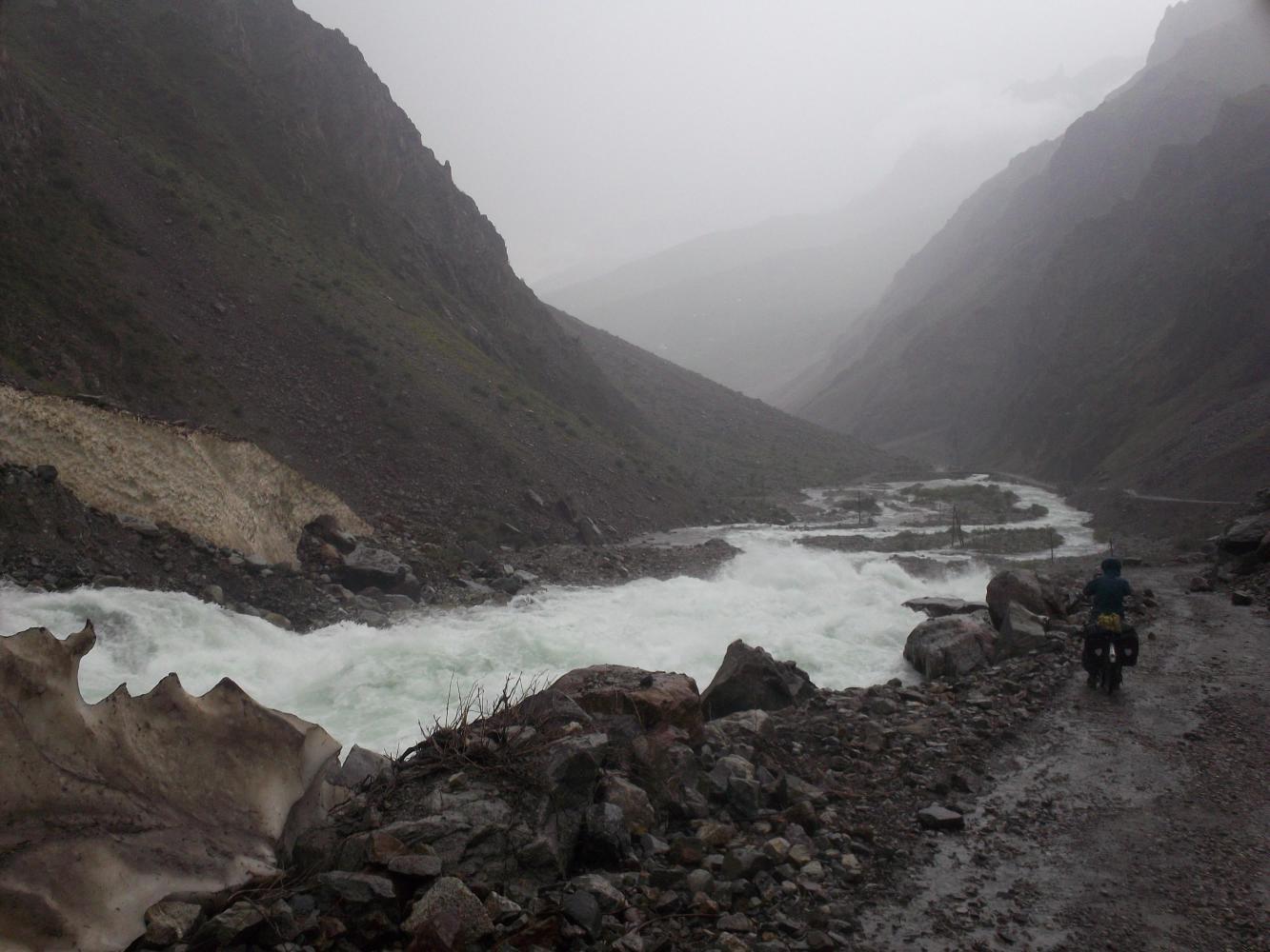 It was raining once again come morning but Rob and I braved the elements and cycled on together, leaving the other three staring forlornly out of their tents at the grey skies. It proved to be not such a bad decision on our part, for the gloom added an extra dimension to the intimidating peaks that rose all around us, and the scenery found new ways to impress. Our river joined another and grew in size to a fearsome swell of white water that tumbled down beside us on our wet gravel road, until finally we reached the town of Kalaikhum that marked the end of our expedition through the mountains together.