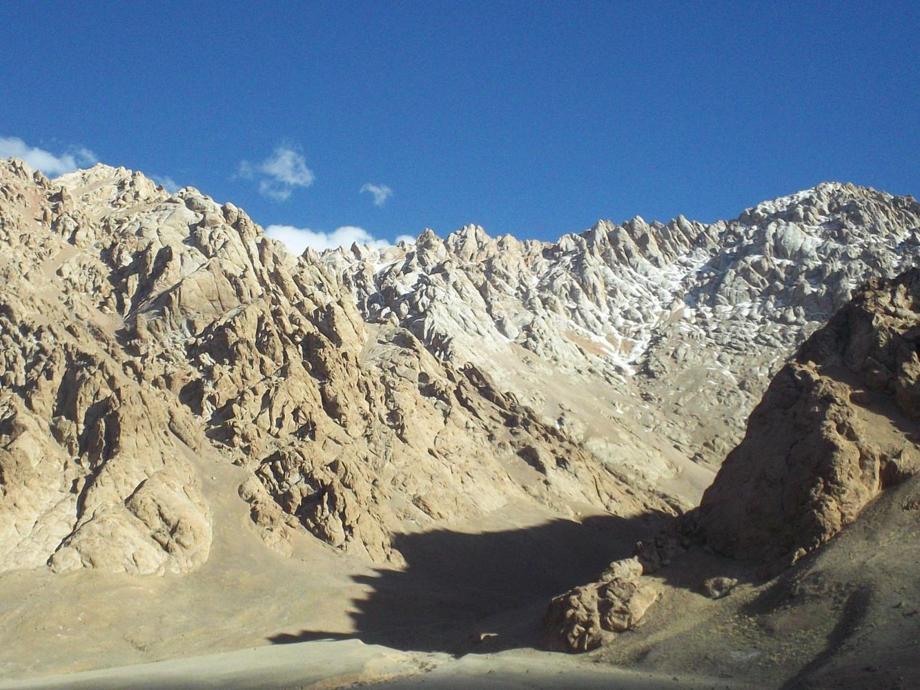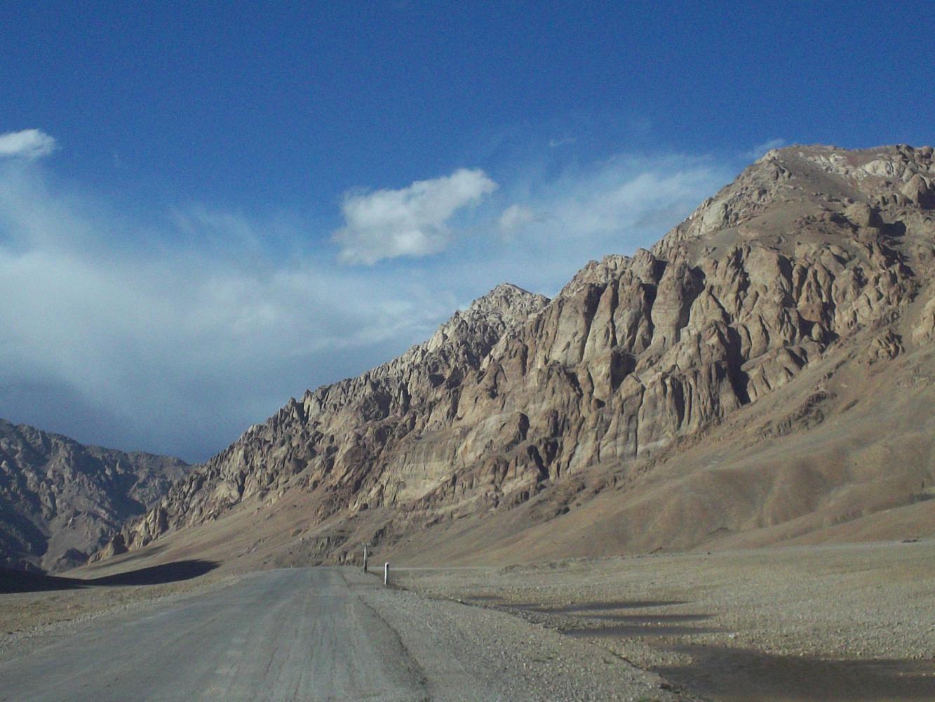 The next day I reached Murgab, a town of 6000 souls living out in the middle of nowhere, where I was able to restock better for the next part of the road, which turned north towards a series of passes. The first of these would climb to 4650 metres and would be the highest point of the road, my trip, and my life, beyond all approximations. As I left Murgab and began to climb slowly my headache was long gone and I was feeling strong and well again. Out on my own again I leaned the bike against a rock at the side of the road to take a break. Places to lean the bike were rare and this rock seemed like it was up to the job. Alas that turned out to be a misconception, as the rock soon gave way, sending my bike somersaulting down the verge at the side of the road. I was sat on the ground and watched it all happen as if in slow motion, the bike rolling over and over like a professional footballer would having taken one in the nuts. Naturally I feared the worst, and you can imagine my relief when it turned out nothing had been damaged in the fall. The worst of it was that it was impossible to push the loaded bike back up to the road, and I had to unhook all the bags and carry them all up separately.