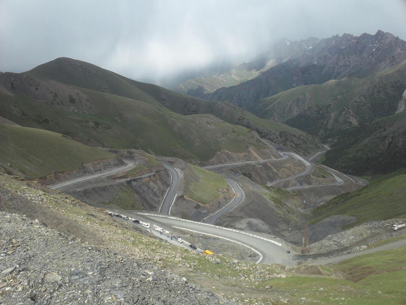 At least upon reaching the second summit I really did have 90 kilometres of easy and well-earned downhill to Osh ahead of me. And the view of the switchbacks down the initial steep descent was really something. But as I looked closer I saw a tailback of cars not moving anywhere. The words of the old man came back to me. "The road is closed, stay in my hotel, the road is closed." Now I was stuck on a mountain top and it looked like he might be right after all, but there was no way I was going back over those two passes, not for love nor money.