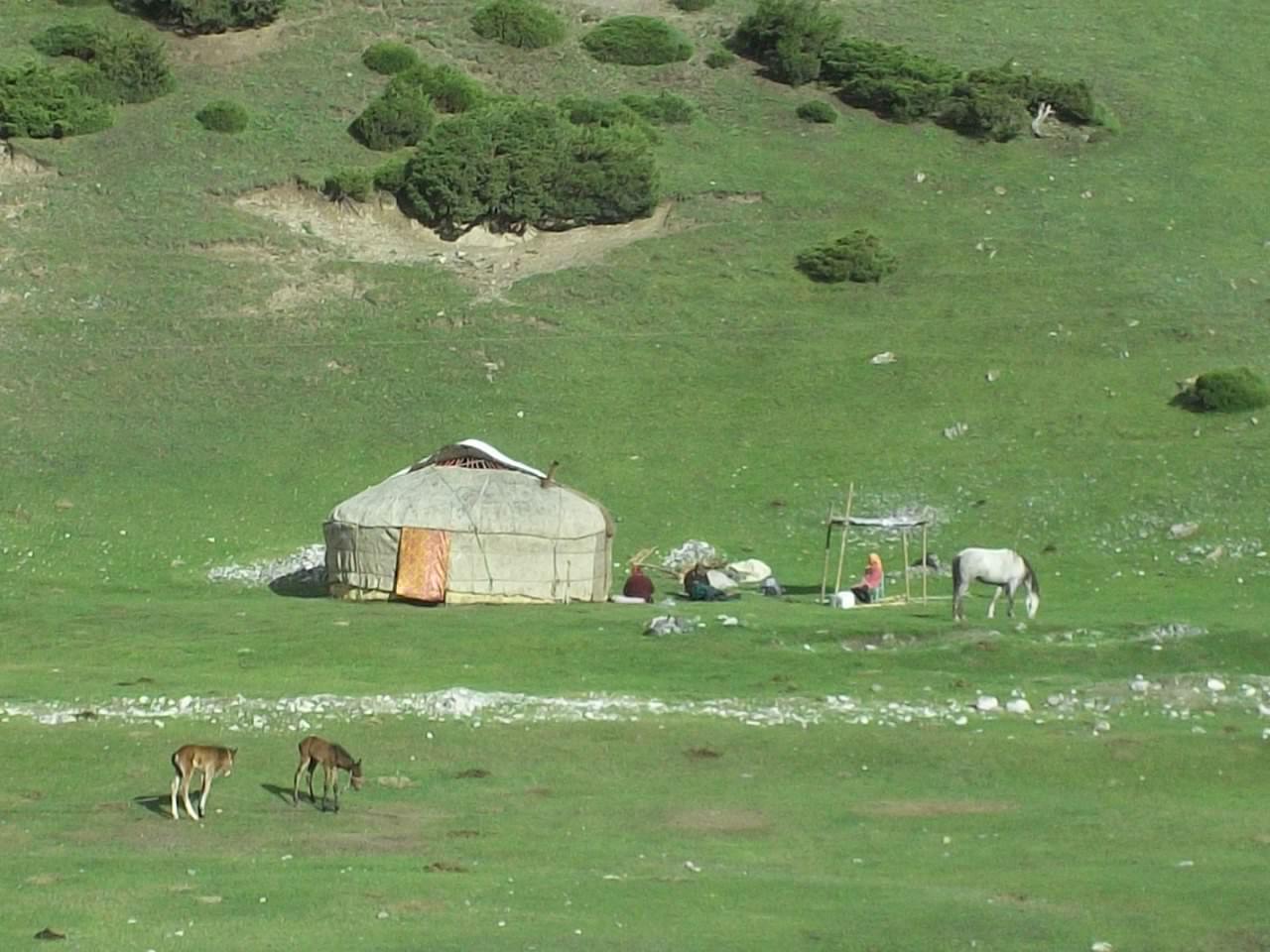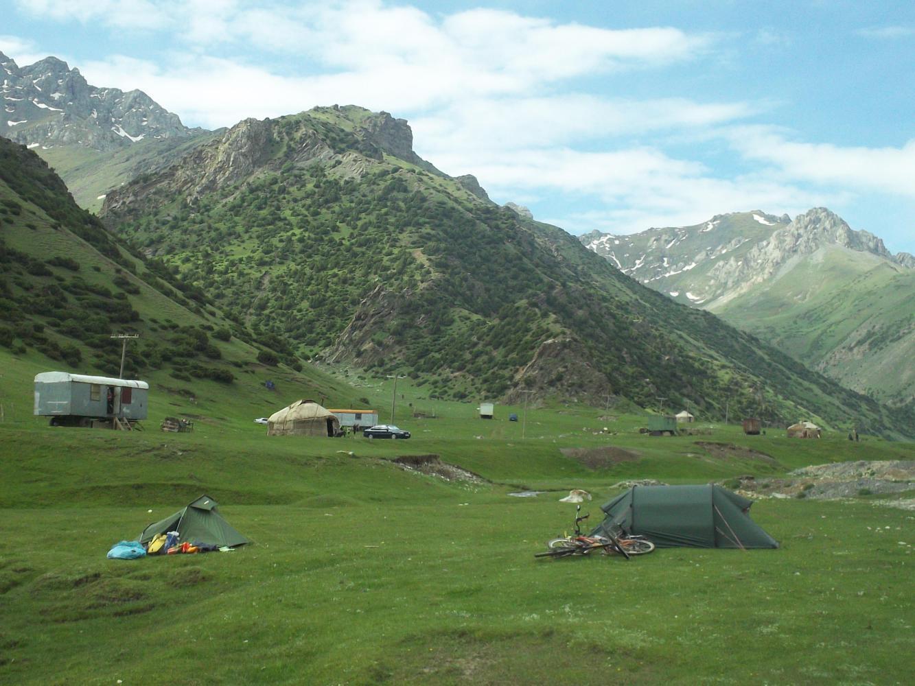 Ana had started cycling from Cambodia six months earlier, and was on her way back to France. She had come through China and was going to Tajikistan, Uzbekistan, Turkmenistan, Iran, Armenia and Turkey. Or to put it another way, exactly the same route that I had just done. Still, it was already early evening, and I was sensible enough to suggest we camp together. I told her about the grassy area with the yurts and we cycled back up through the village that way and set up our tents.