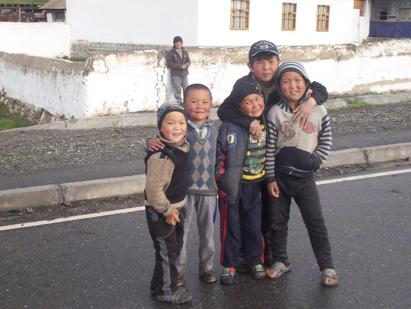 Back on the tarmac I was finally able to enjoy my hard-earned and relaxing descent. But alas the road was wet and of course my stupid front mudguard had broken off the day before, so a steady stream of water curved up from the road and directly onto my face. Mmmm, relaxing! Beyond the switchbacks I entered a valley with grassy patches besides the river where there were many yurts. People were living in these traditional tents as their animals grazed around. The children all shouted out and waved happily as they saw me and the sun even came out, making everything seem much better. But the road was still wet and I stopped at the start of a village to put my poncho on. Veronque had given me this in Dushanbe upon hearing I was planning to cycle the Pamir without a rain jacket. It had been left at her place by another cyclist, an understandable thing for someone to do given how ridiculous it looked. I mean, it was a poncho after all. But keeping dry seemed more important than looking good for the kids, so I put it on all the same, and it flapped around like a cape as I continued down into the village.