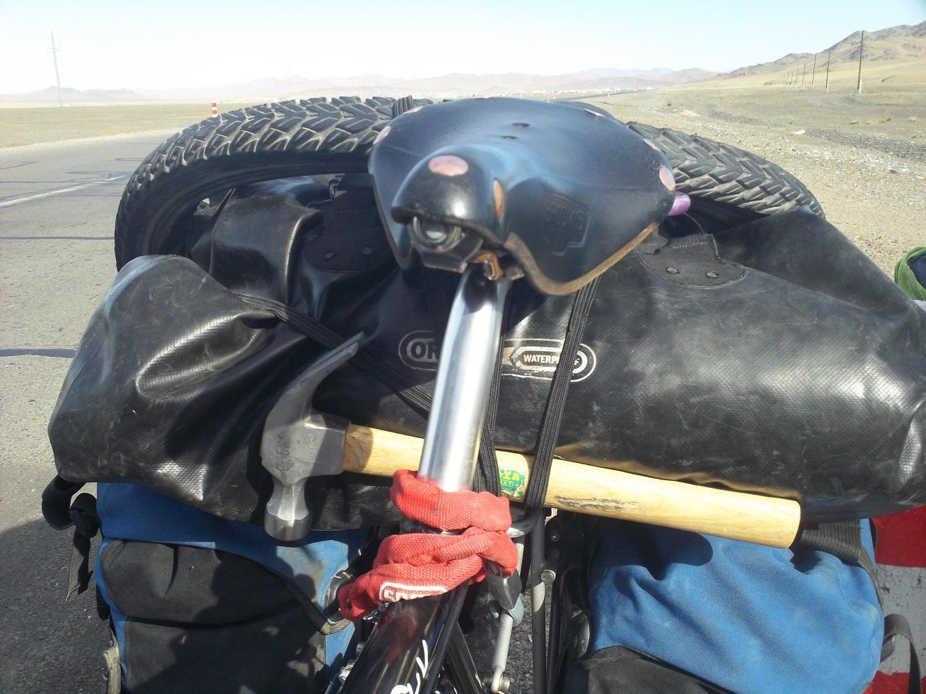 With Elinzska's worrying story still in mind I asked Bak Hyung Yeol if he'd had any trouble on the way. I was thinking along the lines of the people, potentially being robbed and so on, but instead he told me that he'd seen wolves on the road. The dangers of Mongolia were growing. Then I noticed that Bak Hyung Yeol had a hammer strapped to the back of the bike. "Is that for the wolves?" I asked. "No," he said, "for the tent." Well I guess you can't always find a rock.