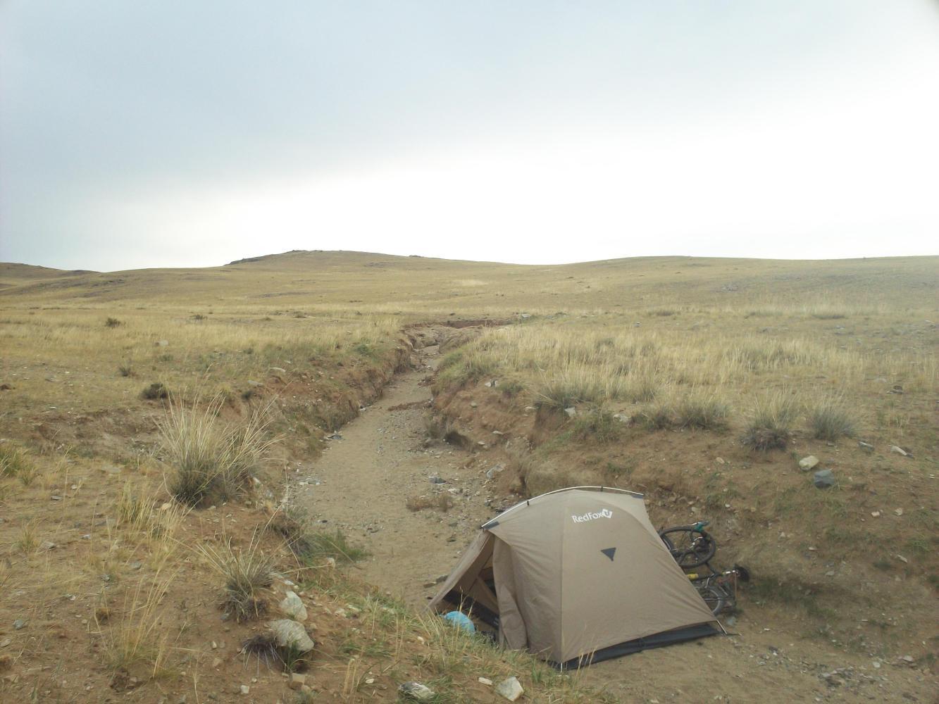 My road became really tough, washboard and sand, and it seemed to be forever going uphill. The wind had also picked up and was practically blowing me backwards. As it came to time to camp I still hadn't arrived at Bombogor and I needed to find somewhere to shelter from the wind. Protected places were almost non-existent but I found a solution by setting up my tent in a dry river bed. The skies were quite dark and it looked like it might rain, and I knew it could be quite silly to camp in a river bed, but I really had to get out of the wind. I made a barrier out of rocks and sand and dug a channel so that if water started flowing down the river bed at least the first of it would be directed around me. Then I came up with an emergency evacuation plan in case of heavy rain. My heavy rain evacuation plan was simple and could be written down in a series of steps. Here is my evacuation in the case of heavy rain plan: