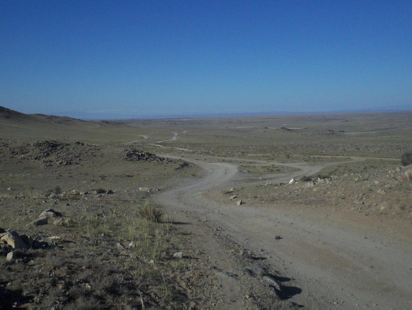 So I followed the electric pylons up a hill on the other side of the village, which led me up to a big antenna. But here the pylons ended, and I was once again cycling blindly out into the lonely landscape. But there was only one set of tracks going west and so I followed them in good faith.
