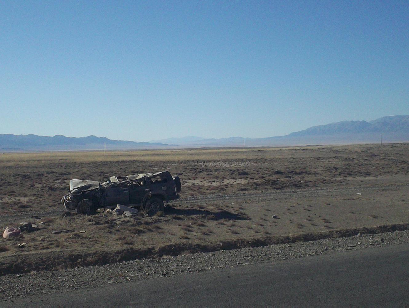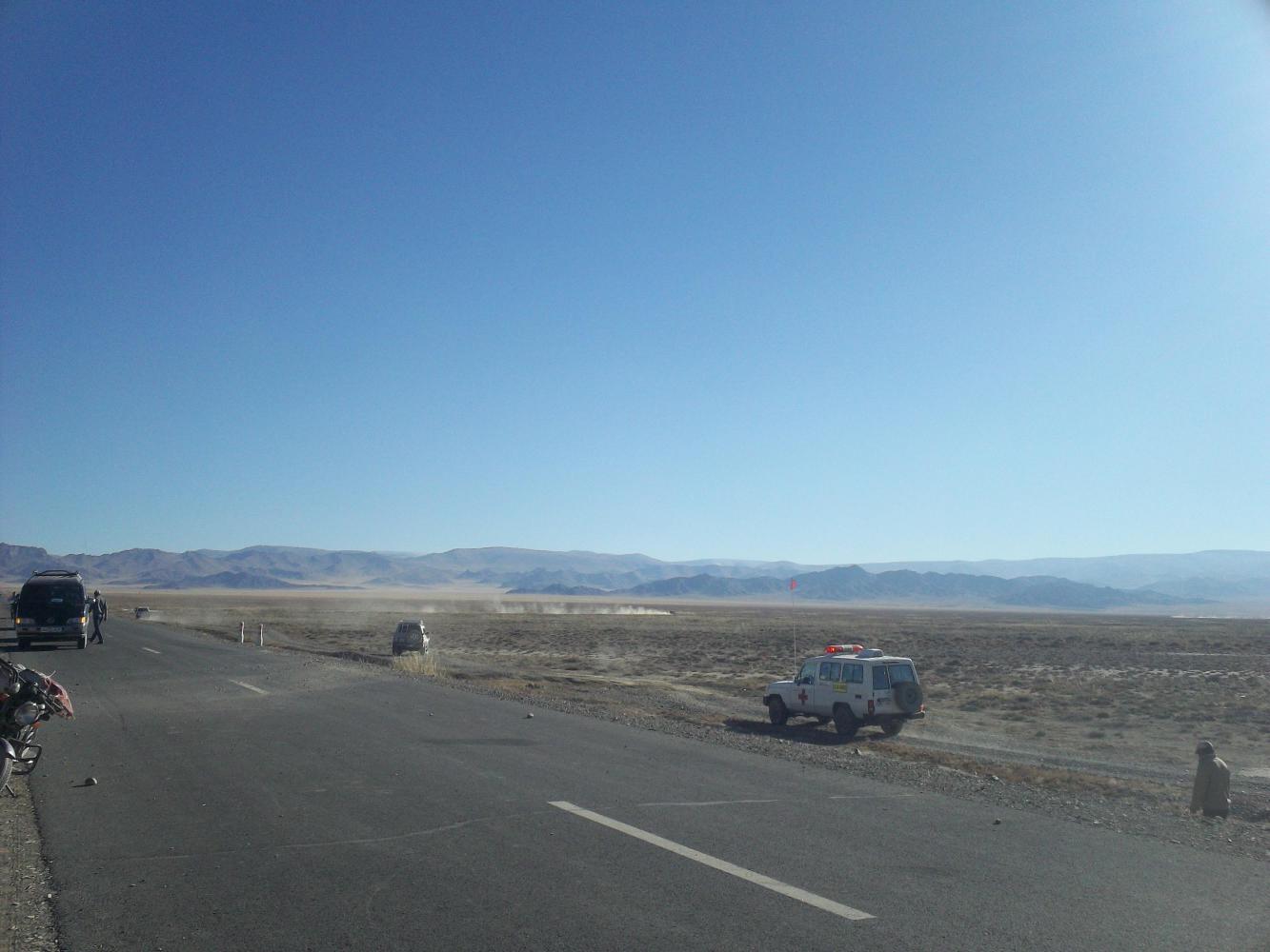 There was only room for two in the ambulance, and the other two men had to be taken in other vehicles. The first man, the one who appeared in the best condition, was moved carefully by a dozen hands into the back of a van. But I watched in absolute horror as the man from the pick-up and the motorcyclist, the two idiots that had been running around shaking people and whom could both be drunk themselves, picked up the unconscious man and carried him dangling limply over to a jeep where he was hurled onto the backseat. This actually happened. With four 'doctors' and a police 'detective' on the scene, this actually happened. A man who had been lying motionless and unconscious on his back having been thrown from a vehicle, who could have had untold spinal damage, was moved to the backseat of a jeep with such carelessness. And then all of the 'ambulances' took off in the direction of Tsetseg across the desert tracks, the crowds dispersed and the police detective went home for his tea. And there was just me left, staring blankly at the wrecked car and the bottle of vodka that lay as it had landed, motionless in the sand.