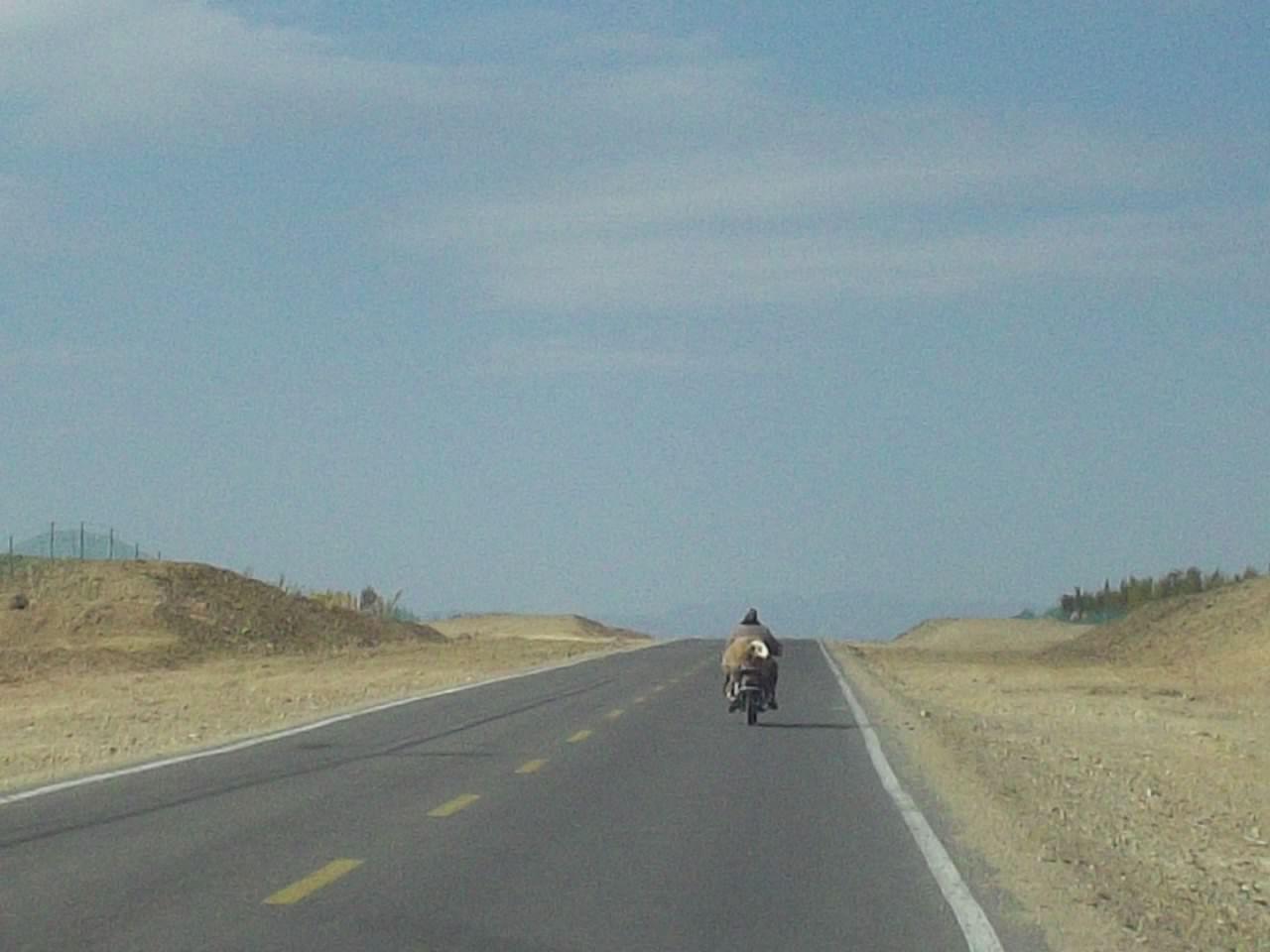I left the hotel and continued, still heading west. I found it very hard and was still feeling down and trying to work out what I was doing out here all alone and all that crappy stuff. There were a lot of motorcycles and the people would turn their head and stare at me as they passed, just the same. I also saw a sheep on a motorcycle, but I could tell I was in a civilized country now because instead of requiring a second man to hold the animal, this sheep was simply tied onto the back of the seat. It is this remarkable level of innovation and efficiency that marks China out as the next great superpower.