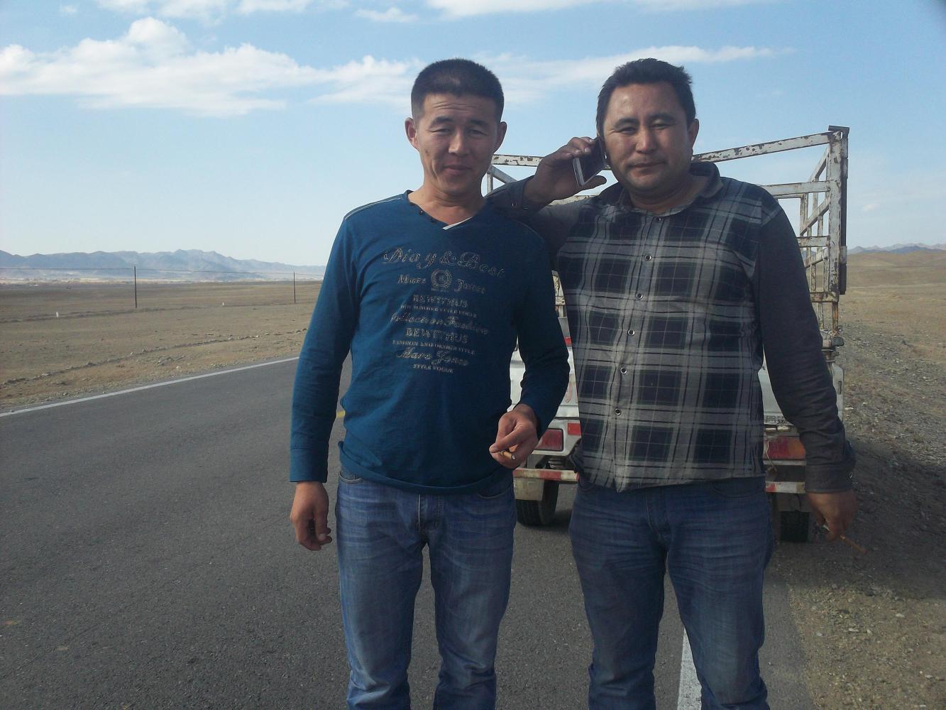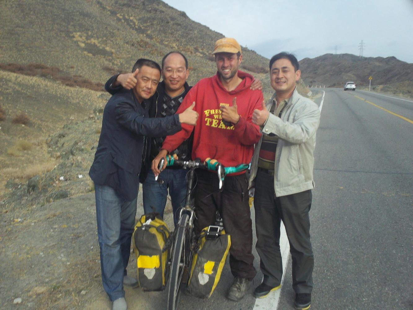 A little later a car stopped and two men got out and talked to me. Well, mostly they wanted to take photos with me. I asked them where they were from and they said they were Kazakh, which explained the photo. I tried speaking to them in Russian but they didn't understand. "Chinese Kazakh" they said. It is a very mixed up region ethnically, that's why there is so much trouble in this province of Xinjiang. The two men were nice enough and gave me a bottle of green tea to take with me.
