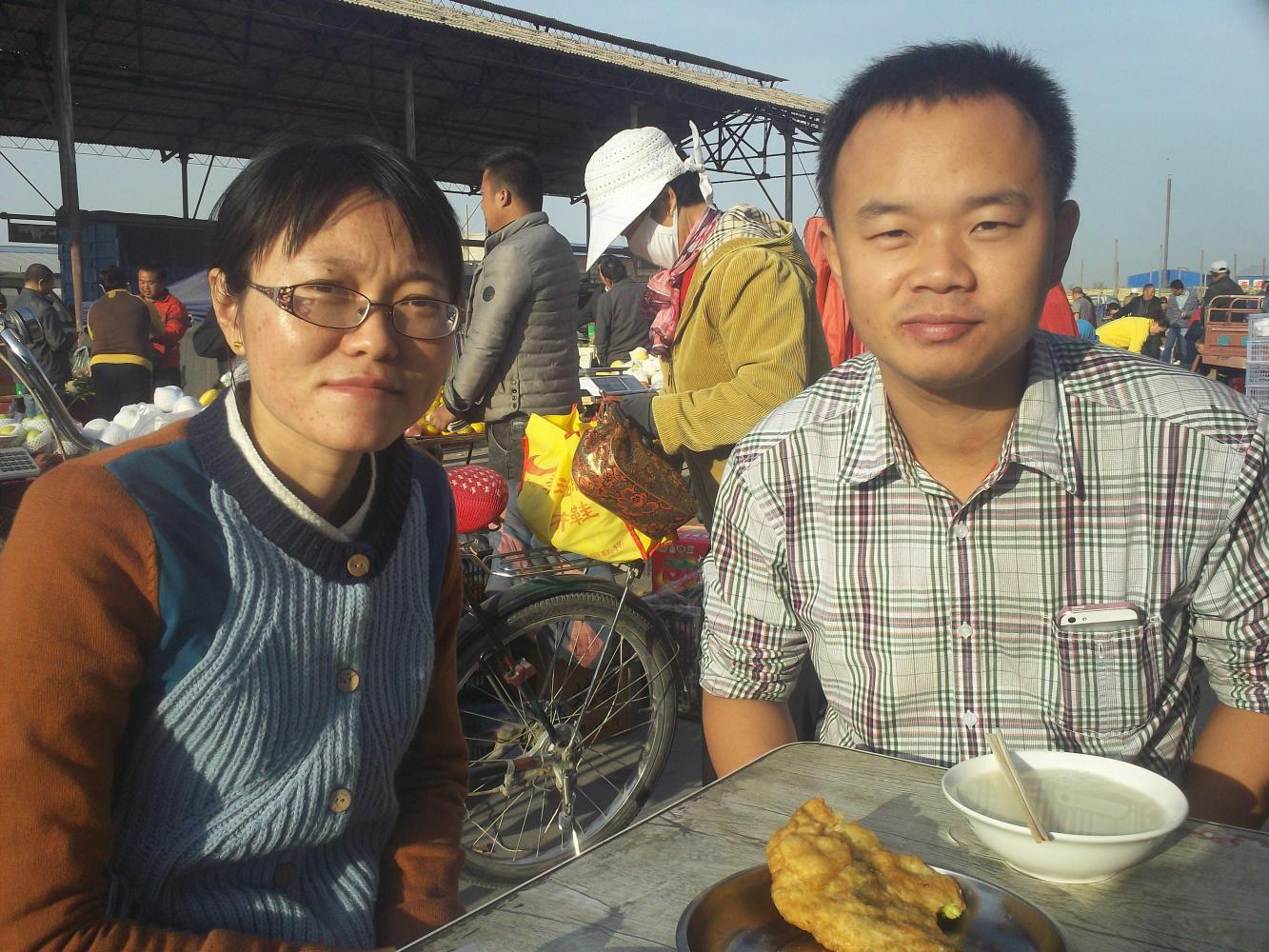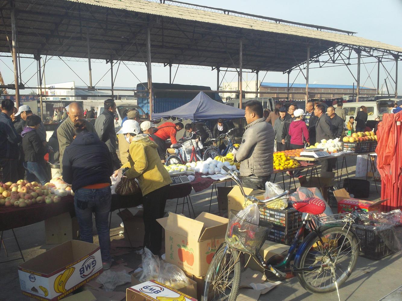 The next morning things got even better. I wanted to stock up on some fruit and vegetables that they also don't sell in the shops (or expressway service stations) and so Jshe-Jshe and his wife took me to the daily morning market. Now this was really something special. 'Here at last is the real China!' I thought as we walked among throngs of people, some of them wearing masks against the pollution, others on bicycles, shouting and haggling amongst rows of apples and grapes, potatoes, carrots, onions, everything. I noticed chickens in tiny cages, others running free in the dust. For the first time that I can ever remember I had the idea that maybe the bicycle wasn't the best way to travel out here. Whilst I was being bored to tears on the expressway all this was going on - real, raw, exciting, interesting life - and I was missing it most of the time. But I wasn't missing it now as I sat with Jshe-Jshe and his wife eating delicious street food together and soaking up the atmosphere all that I could.