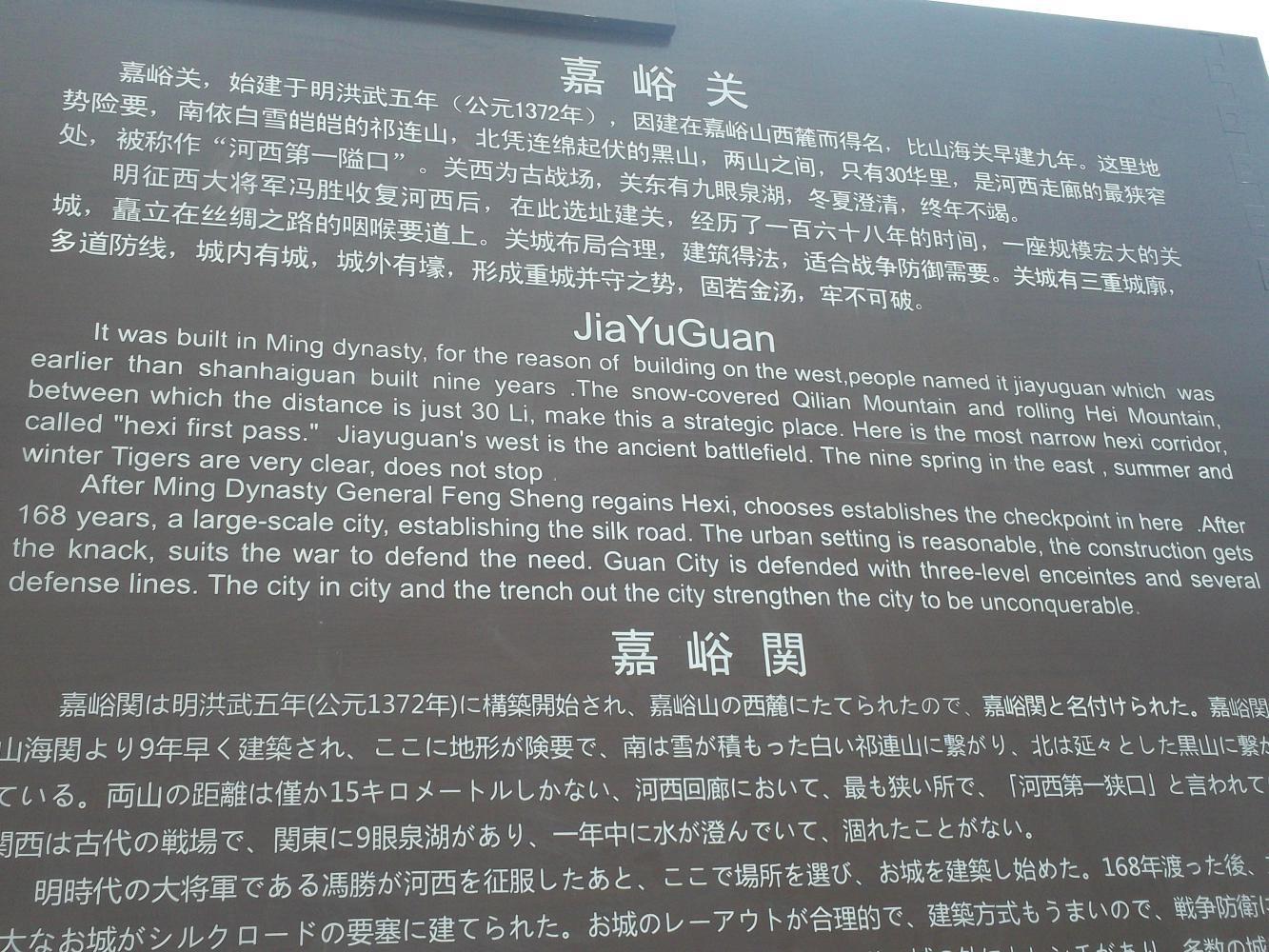 I was trying to find the fort and eventually a nice man pointed me to a travel agents where I got a map. It turned out that the fort was right next to the road, just the wrong road. It would have been easy to spot had I arrived on the G312, but as I'd taken the G30 I ended up cycling an extra ten kilometres across the city to get back to it. But I got there and went to buy my ticket. 120 yuan. That's 12 pounds! A little steep, but come on it is THE GREAT WALL OF FRIGGIN' CHINA! Of course I was going to see it. So I bought my ticket and walked towards the fort, where I came to the main information board. I think you'll agree that this was worth the entrance fee alone. Stick with it, it almost makes sense at the beginning, but then it gets good:
