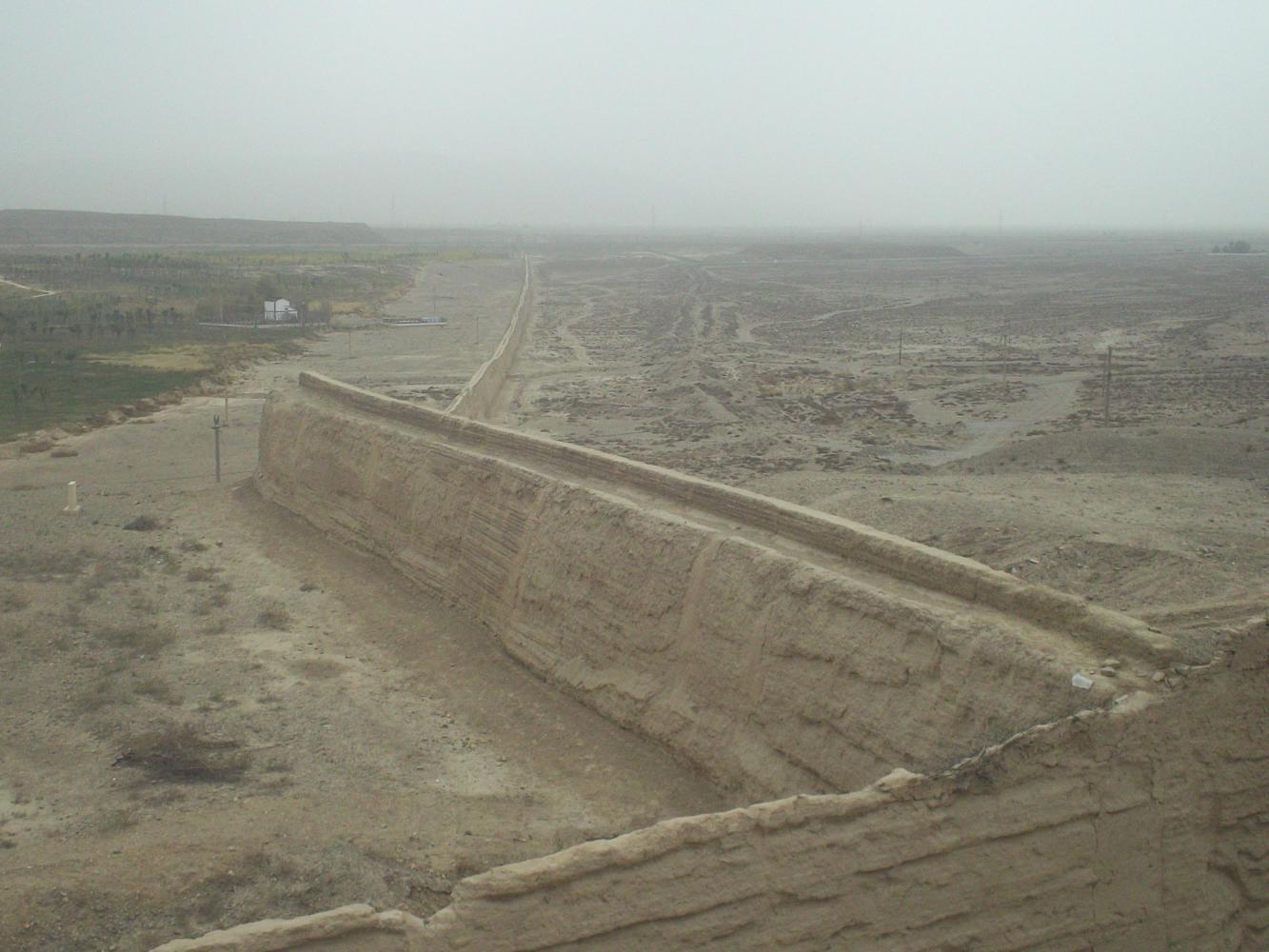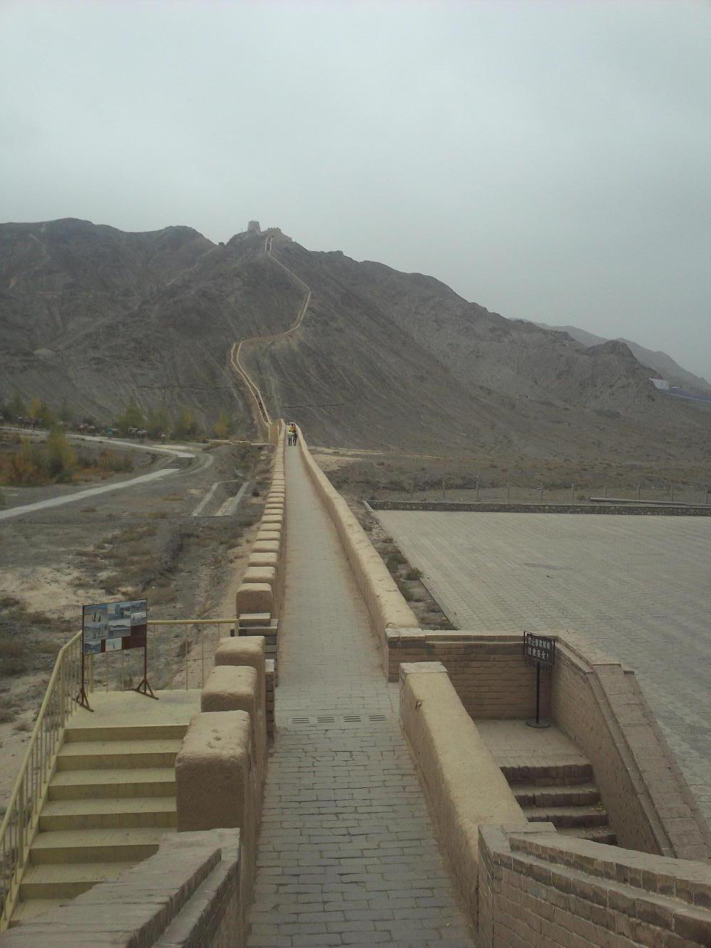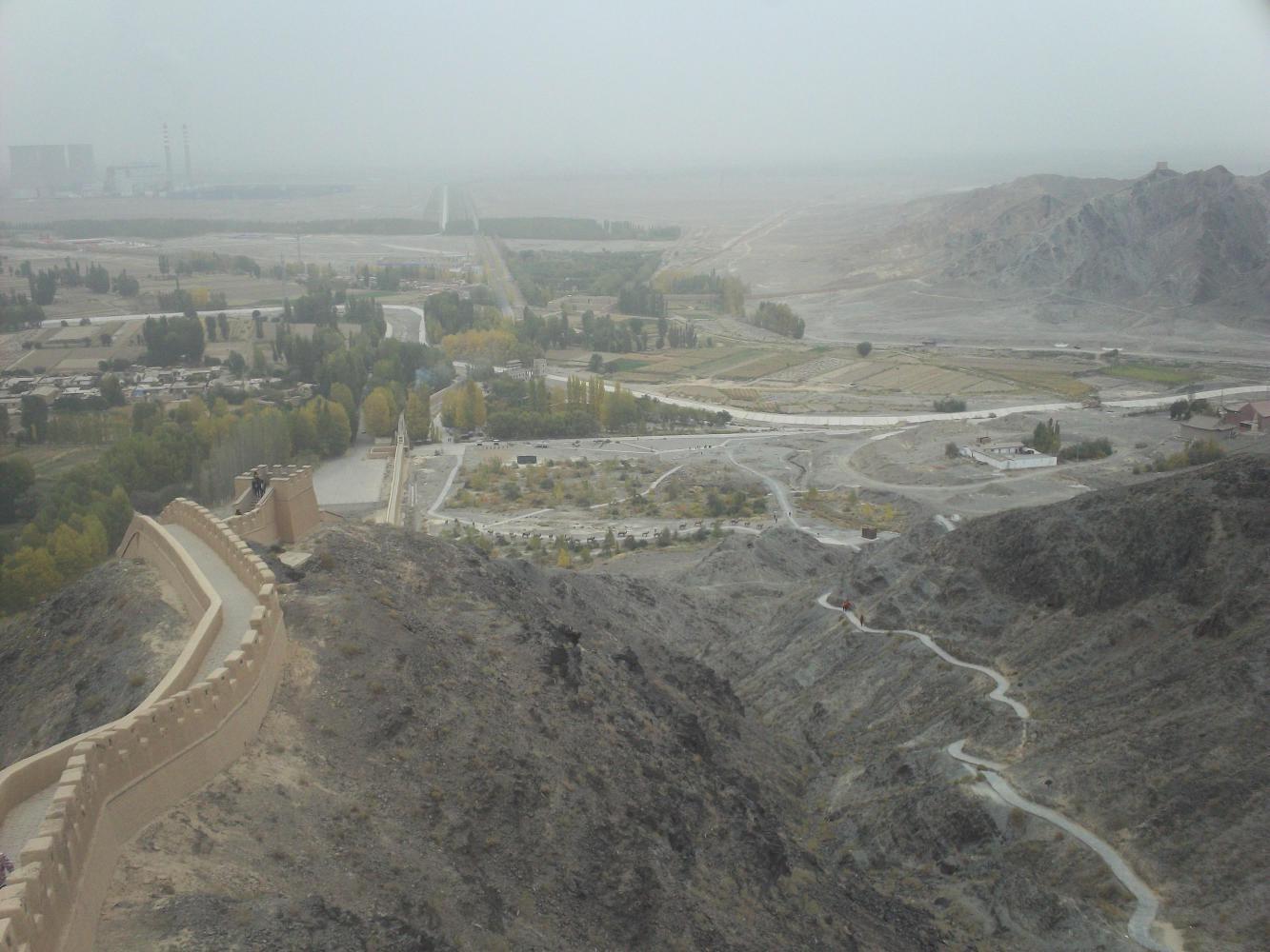 Daybreak came although there was no sunrise as it was an overcast day and I switched back to the G30 to save time. The road was climbing steadily uphill but I approached the city of Jiayugan with 100 kilometres already on the meter by around midday. I knew Jiayugan was a special place because it marked the western end of the Great Wall of China and I was really excited about going to see the famous landmark. I knew that there was a fort and that it was just next to the road and I'd expected it to be signposted from the G30 and easy to find, but it wasn't. And, far from the romantic visions I'd had of seeing the Great Wall as I approached Jiayugan, all I was met with were smoke stacks and cooling towers and some of the most polluted air I had ever had the misfortune to have to breathe.
