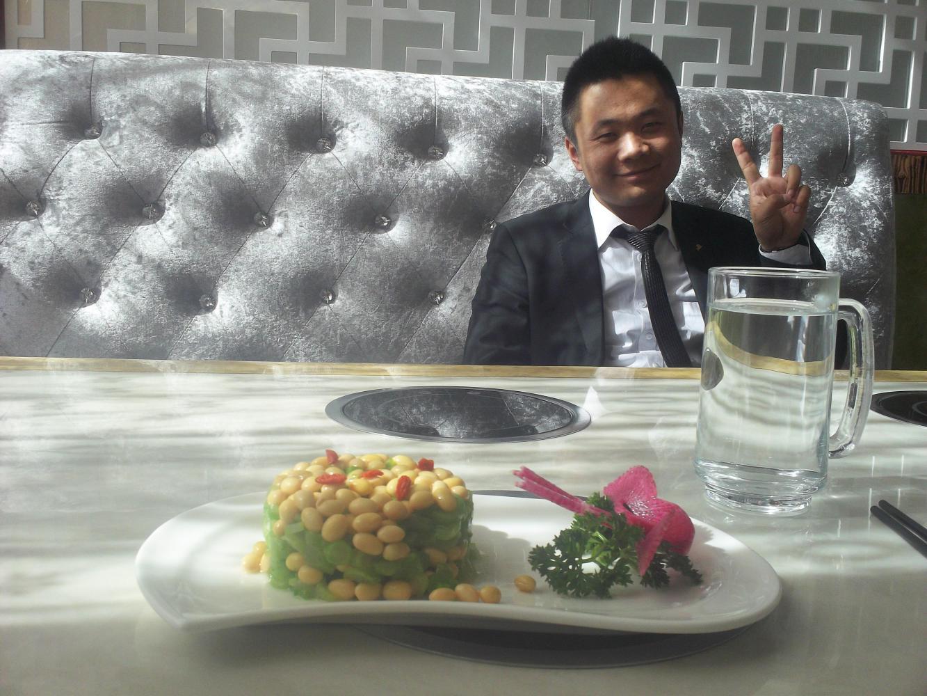 Zhou Kang (correct spelling, I took his card) was a nice young manager and he was very happy to meet me, and kept passing me his I-phone with very difficult to understand questions translated on it. Another bonus of his prescence was that he took pity on my pathetic attempt to jab the above dish with chopsticks, and incredibly a fork was somehow found and brought to me by a waitress, who had to unwrap it from its original packet for me. After I finished eating Zhou Kang insisted on a prolonged photoshoot with me and my bike, leaving him very satisfied, although this wasn't enough to score me a free lunch unfortunately.