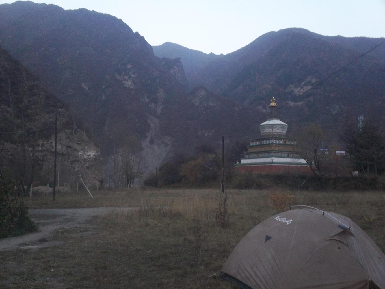 We were climbing up into the mountains again and I was wondering where in hell I was going to be able to camp away from all this noise when the road once again dived into a tunnel and I took a diversion around the mountainside on a smaller road staying close to the river. Well this was a lovely little detour and it took me through a little Buddhist village, my first one, and there was an empty abandoned plot of land that looked just the ticket for a secret little camping place where no one would see me. But there was a group of five people outside of a temple opposite and so I waited until they went inside a nearby building that I took to be their house, and then I pushed my bike to the back of this empty plot. I was hoping that nothing else would come along the village road as I was doing so, naturally preferring not to be seen. I made it to the back of the plot of land, where there was a big rock to hide behind, just in time before a motorcycle went along without seeing me. Phew. That was a close one. Then I looked back. The five people were all staring at me.