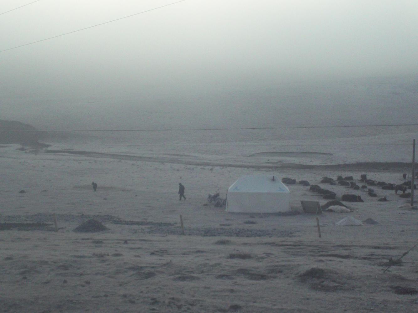 Although the recent days had been filled with blue skies and sunshine, the nights were getting colder. I longed for my long-lost winter sleeping bag, thrown away in a fit of space-saving passion back in Turkmenistan, but all I had was my cheap Tesco summer sleeping bag. Although I must credit Tesco for the fact that the sleeping bag had not broken despite having being in the hands of a man who breaks everything for more than a year, it was not designed for nights like this. Fortunately I had just enough clothes, crucially including a down jacket, to survive another October night above 3000 metres. But this time the morning brought little respite, as I unzipped my tent to find myself in a colourless world. Heavy fog enveloped everything, and a thick frost stuck to the grassy plains.
