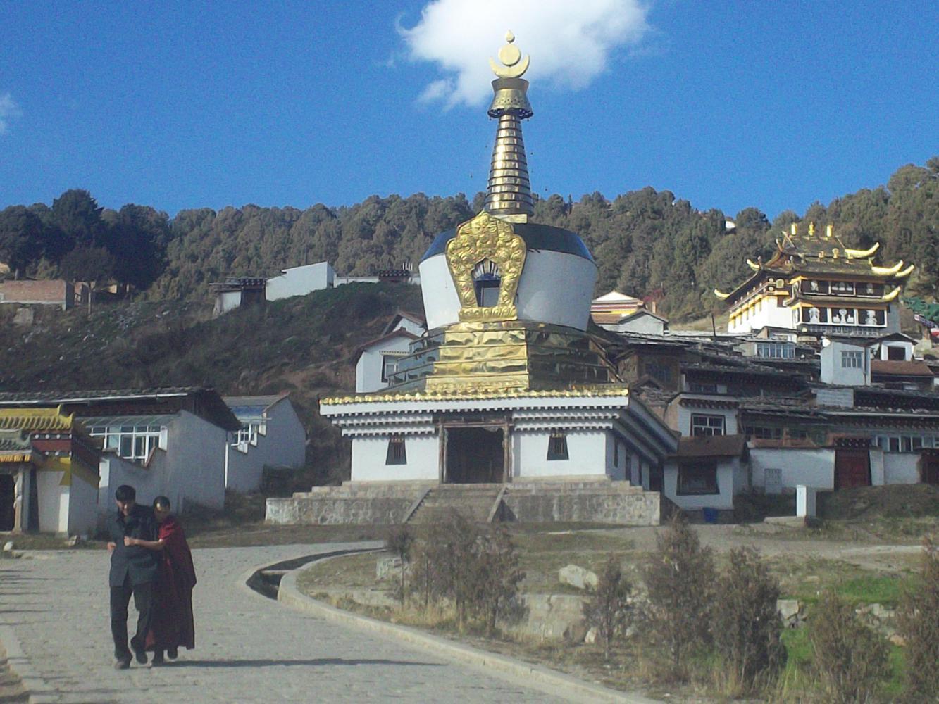 I cycled up to the first of the monasteries. The reason for the two monasteries being that Langmusi is split down the middle by a river, and the north side of the river is in Gansu province and the south in Sichuan, and each side therefore needing its own monastery. The one on the Gansu side, which was up a very steep hill, was the one that I went to first. My arrival at the top of this hill panting and gasping for breath drew the attention of several Chinese tourists, leading to a predictable photo-shoot. Once this formality had been completed I was able to turn my attention towards the monastery, an ensemble of temples and buildings with those magnificent and majestic gold tiled roofs and so on. It made quite a stunning image, with the sun shining brightly on these colourfully decorated temples and the natural rockface behind, which itself was also magnificent and majestic. My only disappointment being the lack of monks. I'd honestly hoped that there would be hundreds of them, doing all sorts of saintly and good things, but there was just this one, who I believe is committing a crime: