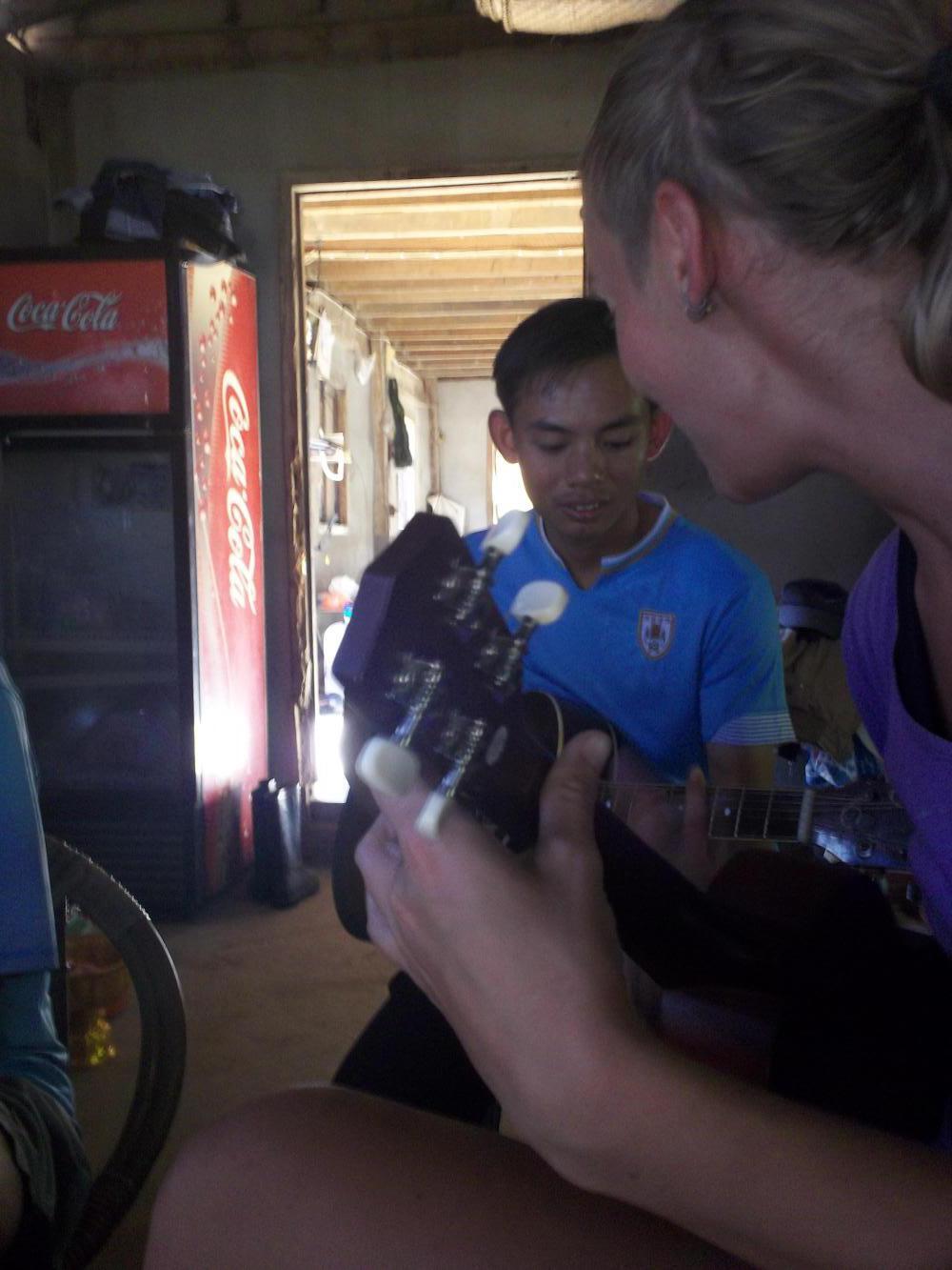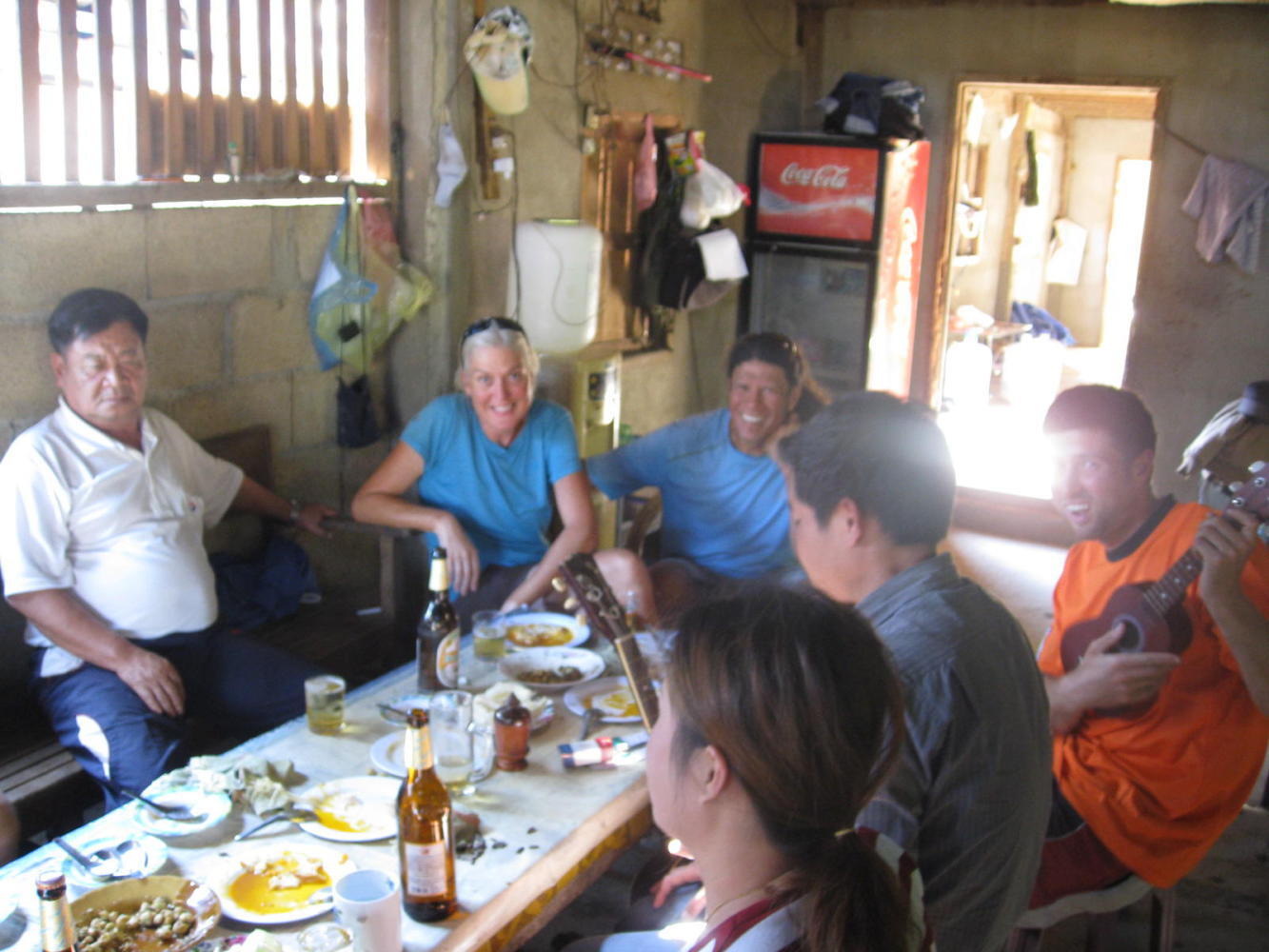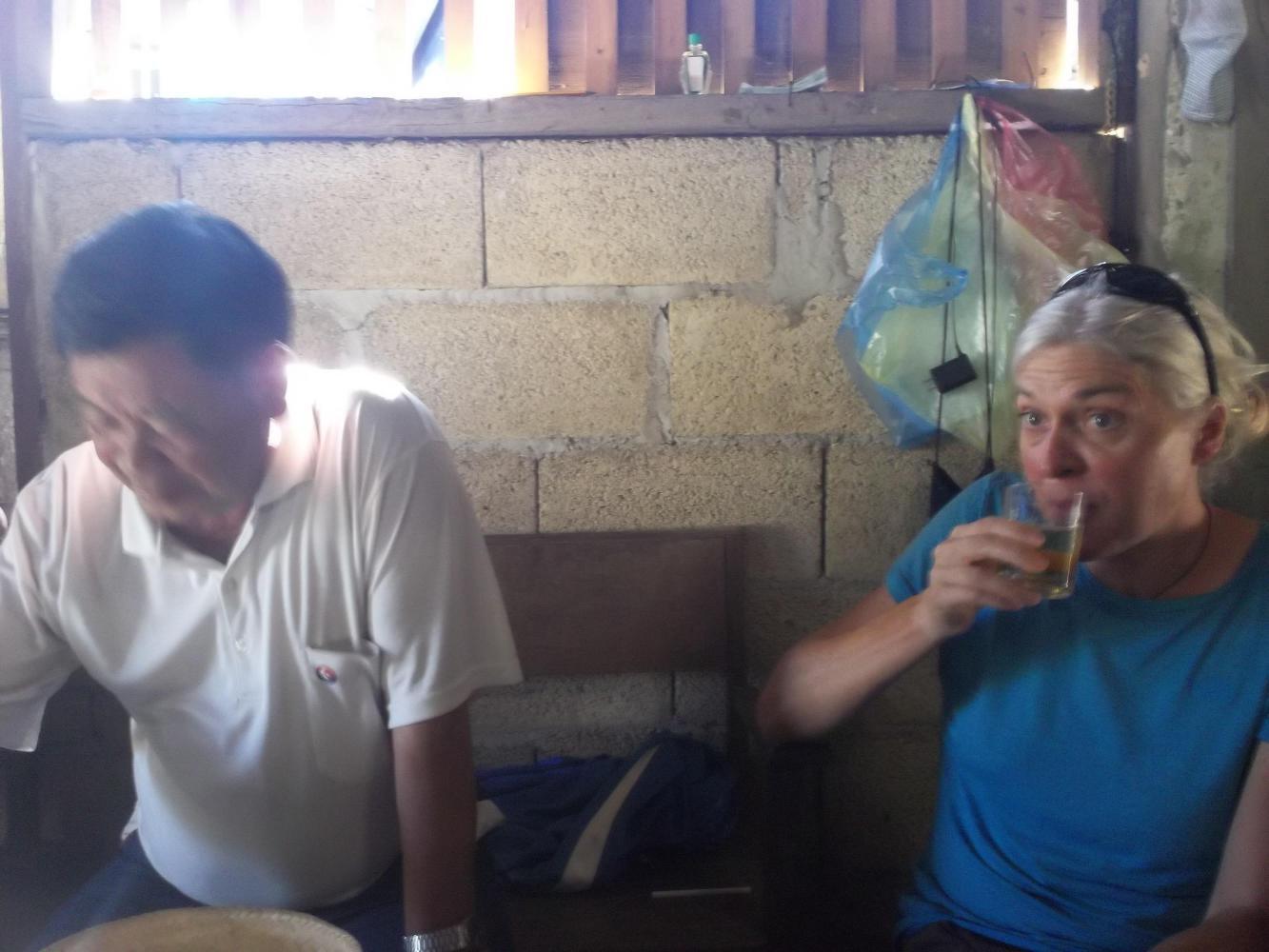In the midst of all this eating and drinking and musical entertainment we succeeded in talking with Nuan, a man that used to work in a 600-dollar-a-night hotel in Luang Prabang (hence his good English skills) and where he was paid 150-dollars-a-month. Now, like the monk that Dea and I had met a few days ago, he had moved home to look after his aging mother. He didn't seem to presently be doing a very good job of that though, because we soon found out that the building we were in now was not actually where Nuan lived, and we began to wonder how welcome we really were when we noticed that, aside from Nuan and The Chief, we were the only ones drinking. The other end of the table remained quite sober, even when the Lao-Lao appeared, Lao-Lao being a strong type of homemade rice wine of unknown but considerable alcohol content. Nuan encouraged us to take a shot and we obliged. "Now you have one eye," he told us, "you must drink another shot and then you have two eyes!" It was two o'clock in the afternoon.