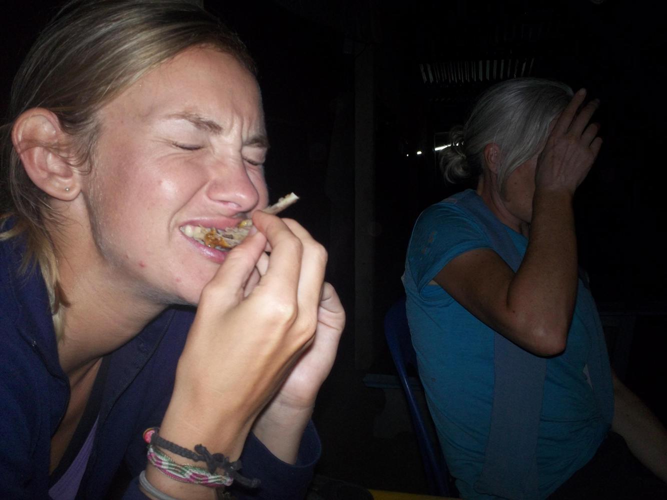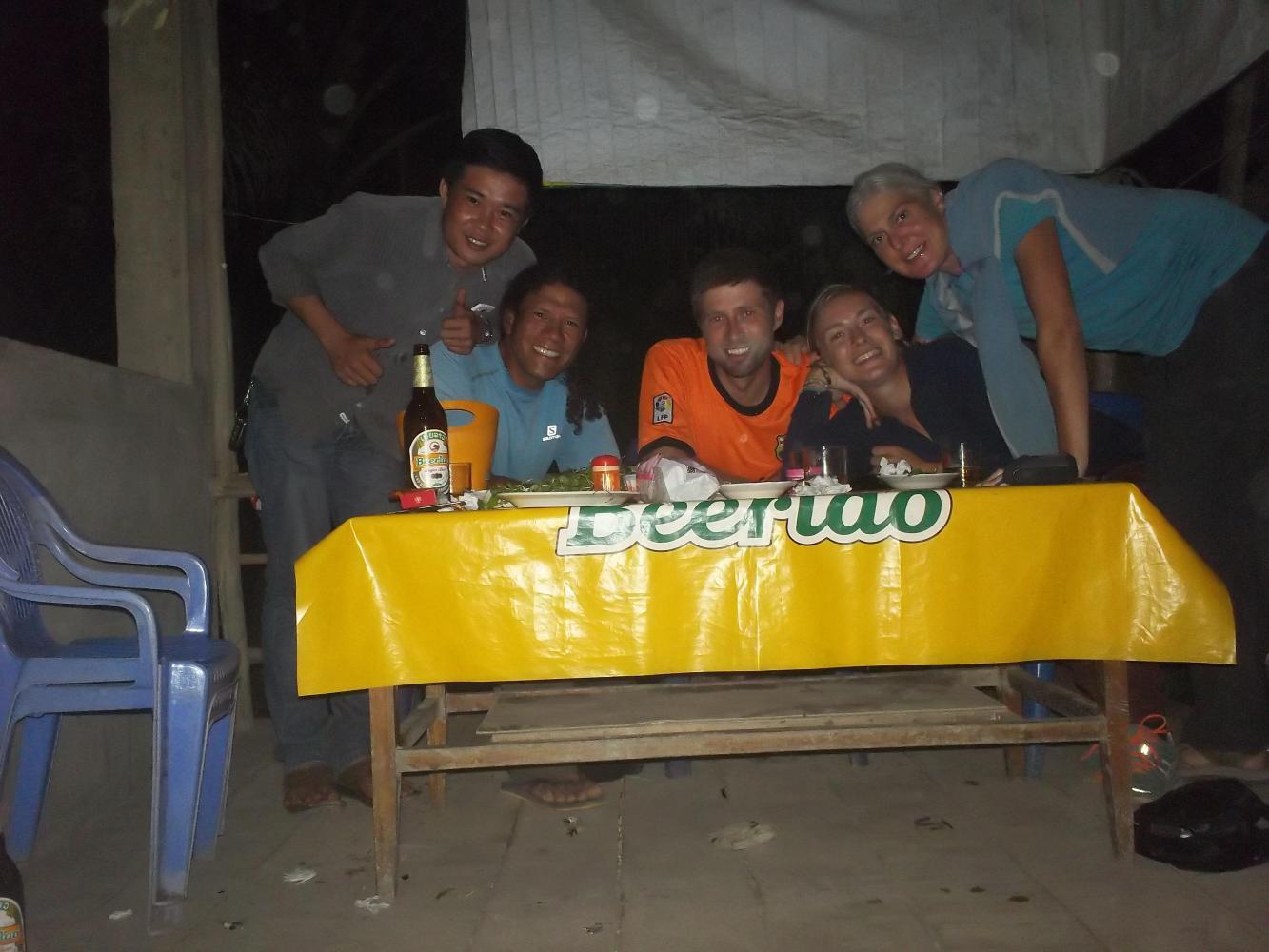 A rather worrying and at the same time not entirely unwelcome addition to the food was the alcohol. It started with the Beer Lao, the national beer which appeared to have a complete monopoly over the Laos beer market, which was poured into glasses of ice for us. Every few minutes a toast would be made and we would all have to clink our glasses together and take a drink. Nuan and an old man opposite him, referred to as 'The Chief' were the protagonists of all of these toasts. The chief certainly liked his alcohol and soon started to look a little the worse for wear, but that didn't stop him from upping the ante and calling for us to all finish our drinks every now and then, at which point we would all take it in turns to down whatever remained in our glass. It was all very reminiscent of my student days.