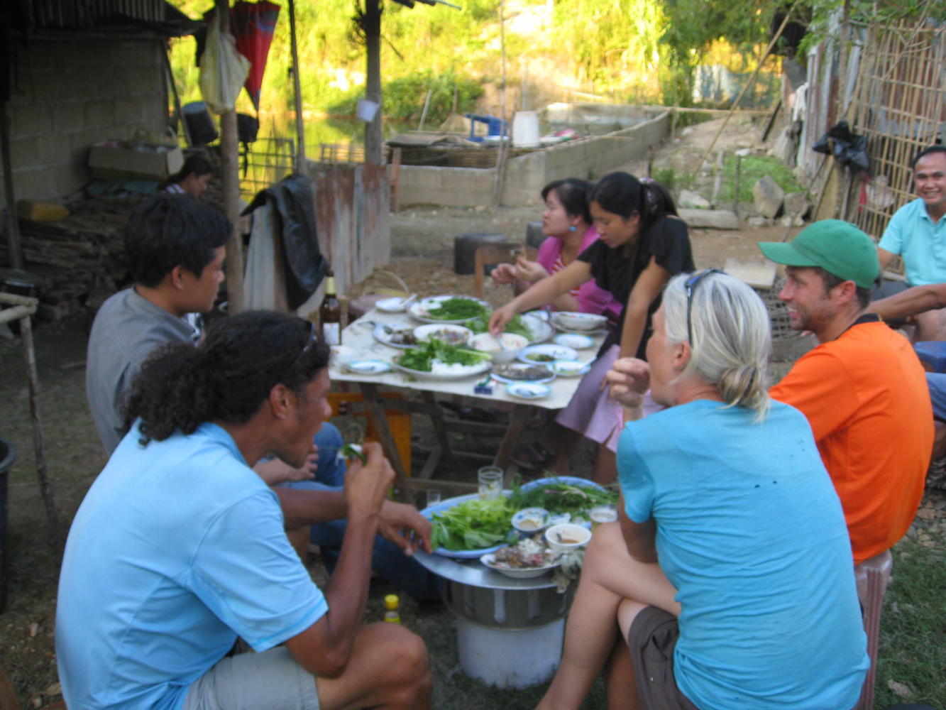 Suzy, Dino, Dea and I consulted as to whether we should stay or go. If we were going to do anymore cycling we were certainly going to need to leave soon, the point of no return was fast approaching. Needless to say we went nowhere. I was having too much fun now. By the time I had myself two eyes, two legs and an arm we moved outside where I think we were all surprised to see it was still broad daylight. There was a big pond behind the house where the family bred fish for eating and selling and the fish that we were promised was soon grilled and served to us. Of course I abstained, and took the opportunity to learn more of the Lao language from Nuan, scribbling everything he told me furiously onto a piece of paper. With The Chief having gone to lie down somewhere I attempted to build some bridges with the rest of the family, and they seemed to appreciate my albeit quite slurred attempts to communicate with them in their own language.