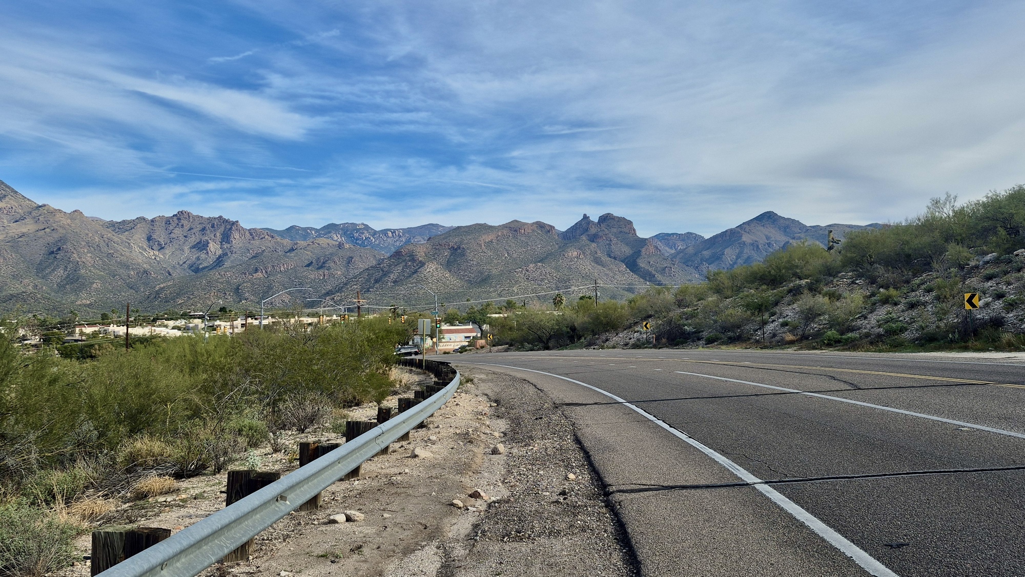 To be honest, it's not the best of rides. Something like 70% of it is on a series of busy arterials: Sabino Canyon, Kolb, Tanque Verde and Catalina all have a decent shoulder and are safe enough, but it's really not until I get within a few miles of Agua Caliente that it's quiet enough that I can hear the birds, if there were many to be heard, which as far as I can tell (my hearing is actually pretty bad) there are not.