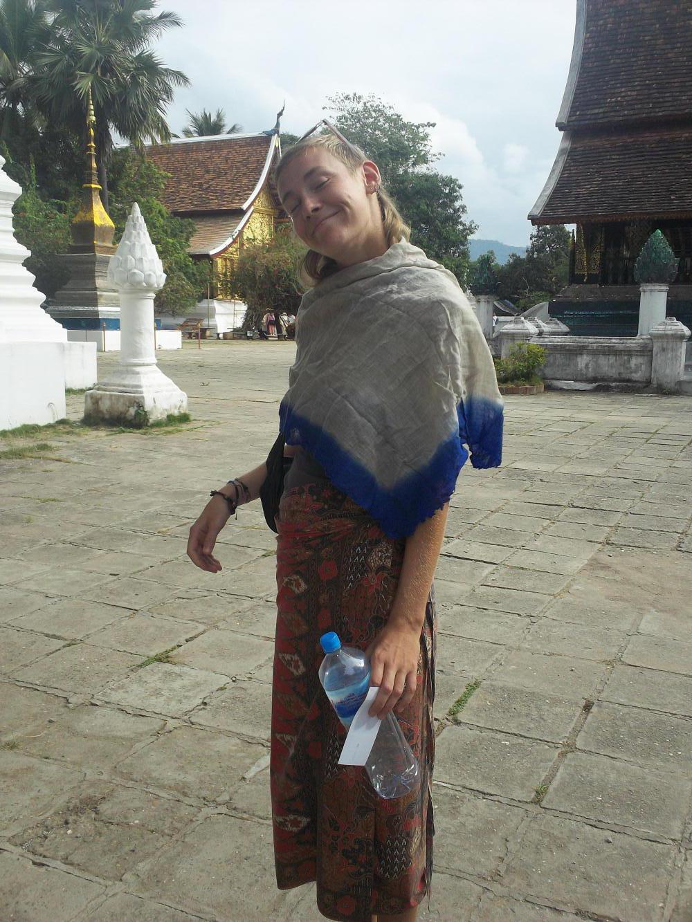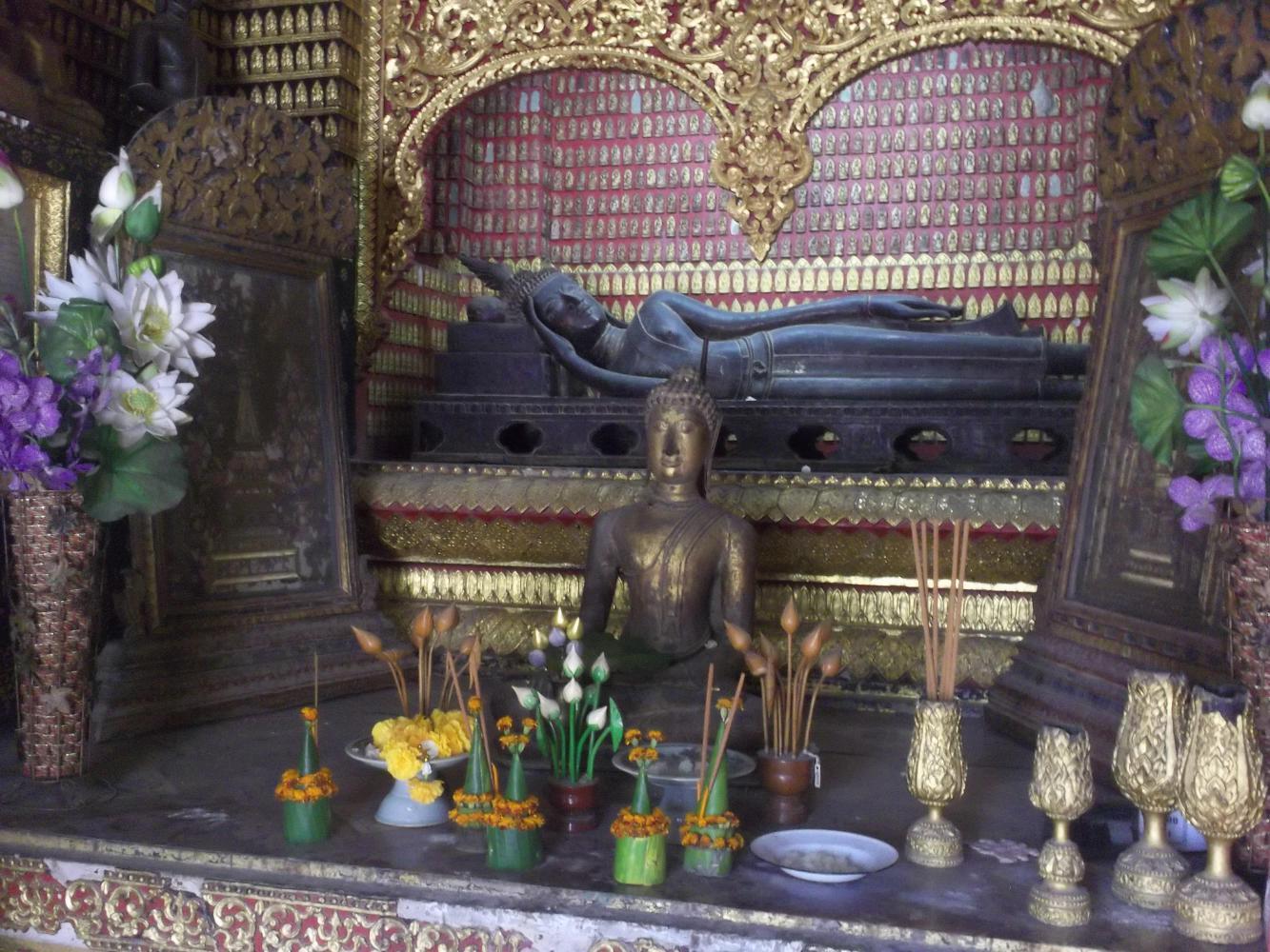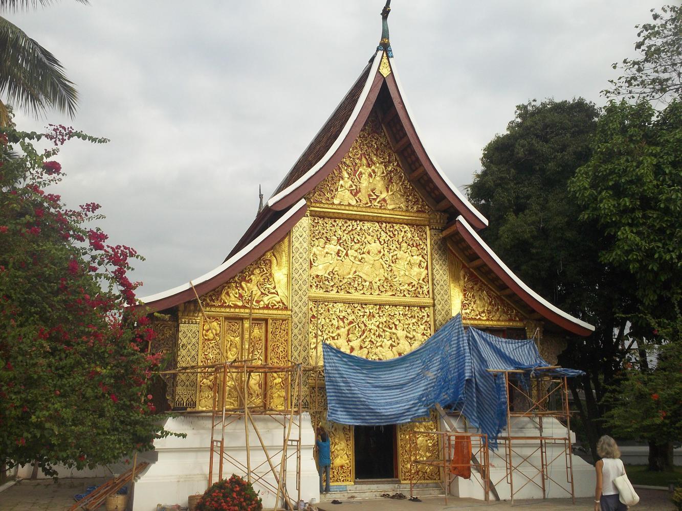 Once our stomachs were thoroughly satisfied we thought it a good idea to do a bit of sightseeing and so we went to the most famous of the temples, the Wat Xieng Thong. At our arrival the ticket woman declared Dea's shorts to be a little too short and her shoulders a little too bare and, as she was at risk of setting monk's pulses racing, she was asked to cover up with rented shawls. Had we felt the need to object I should have pointed out that the monks themselves were allowed to bare their shoulders, well, one at least, and that perhaps this might set Dea's pulse racing, and be just as likely to end in unholy behaviour, but none of us did feel the need to object, and so I pointed out nothing. Instead I followed the others over to the main temple where I removed my shoes and cap, hoped this wouldn't set anyone's pulse racing, and went inside.