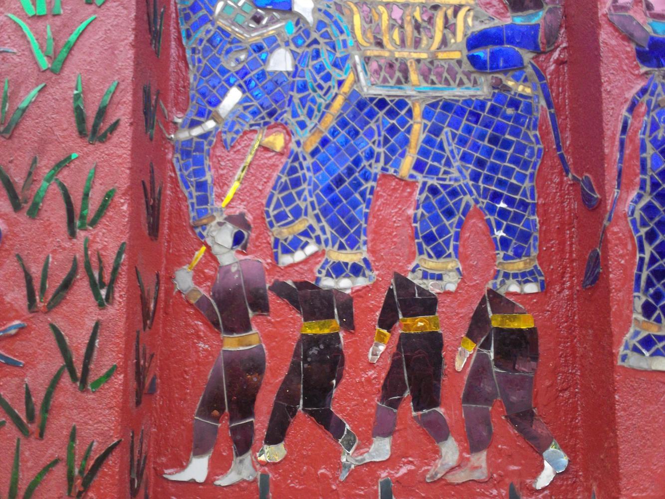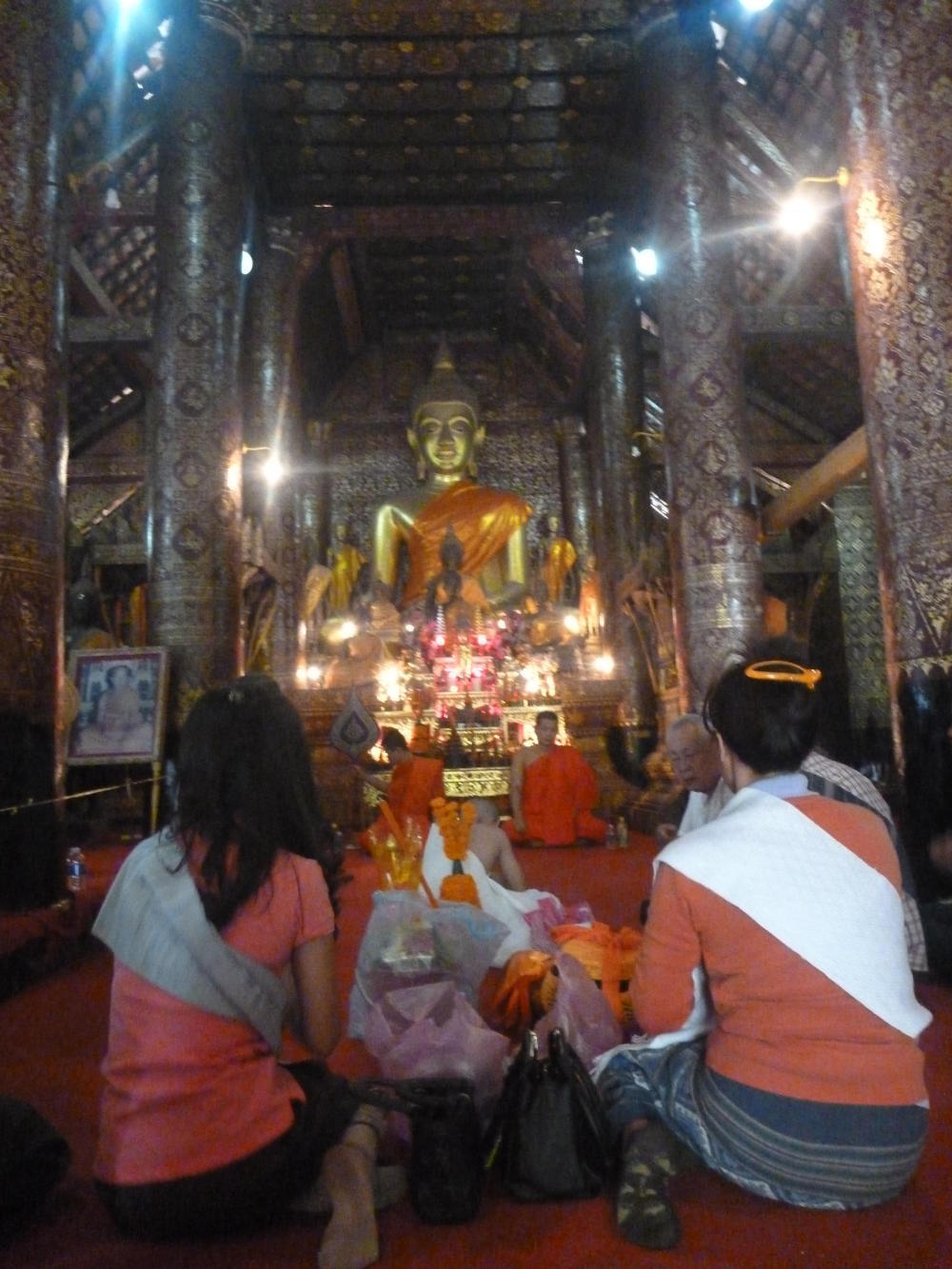 The temple was not very large inside and the eye was immediately drawn to a large golden Buddha at the far end. Below this was a display of many other smaller Buddhas, candles, lights, and offerings. At first the four of us were the only ones there, but as we walked around admiring the intricate drawings on the pillars and walls a small procession of people entered. There were two monks wearing the traditional orange robes, but there was also a young boy wearing the same outfit in white. He was walking with a man that appeared to be his father, and they were followed by a few others, and then, completing the ensemble, came a group of French tourists lead by a rather loud speaking tour guide. He appeared to be explaining that the boy would today become a fully-fledged monk and that his father was here to 'give him away' to the monastery.