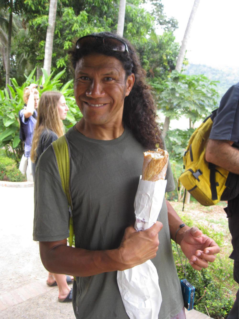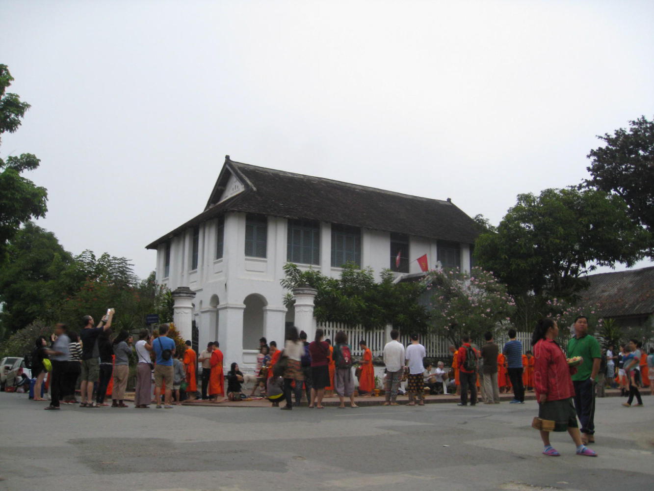 Traditionally the alms giving ceremony involves monks walking around their local area and being given food by the people. This is because the monks are not supposed to work, or to have money, and so the community feeds them in this way. Unfortunately, in Luang Prabang this great tradition has been rather hijacked by the tourist industry and we found that Suzy's predictions proved to be correct. In essence what we witnessed was a bunch of tourists kneeling on the pavement and giving food to these monks, while other tourists stood right in their faces taking photos. Apparently this whole thing has now become such a farce that even the monks don't want to do it anymore, but the tourism industry says that they have to, otherwise they'll replace them with lay people in monk outfits in order to keep up appearances. The three of us watched from a distance, we had no desire to partake in this sorry situation. It was another rather sad reflection on how the influx of tourism to Laos was not necessarily in the best interest of everyone. ♪ ♫ 'Respect the monks, respect the monks...' ♪ ♫
