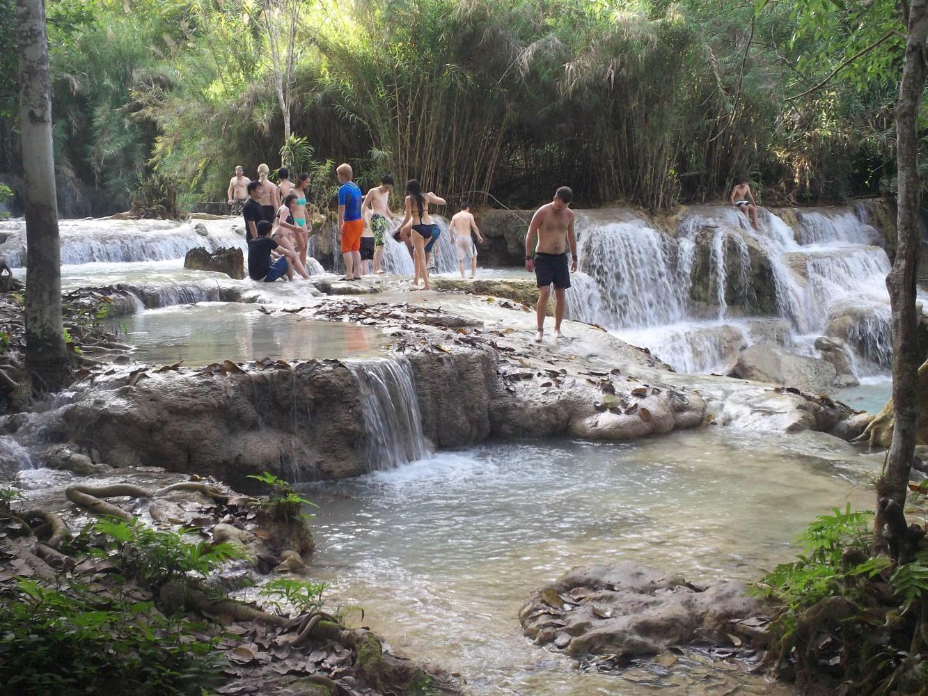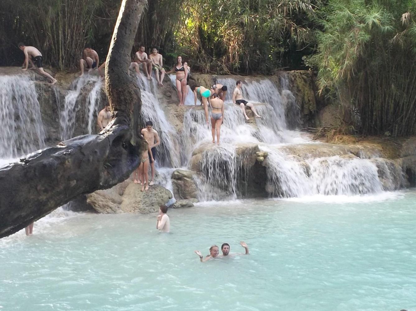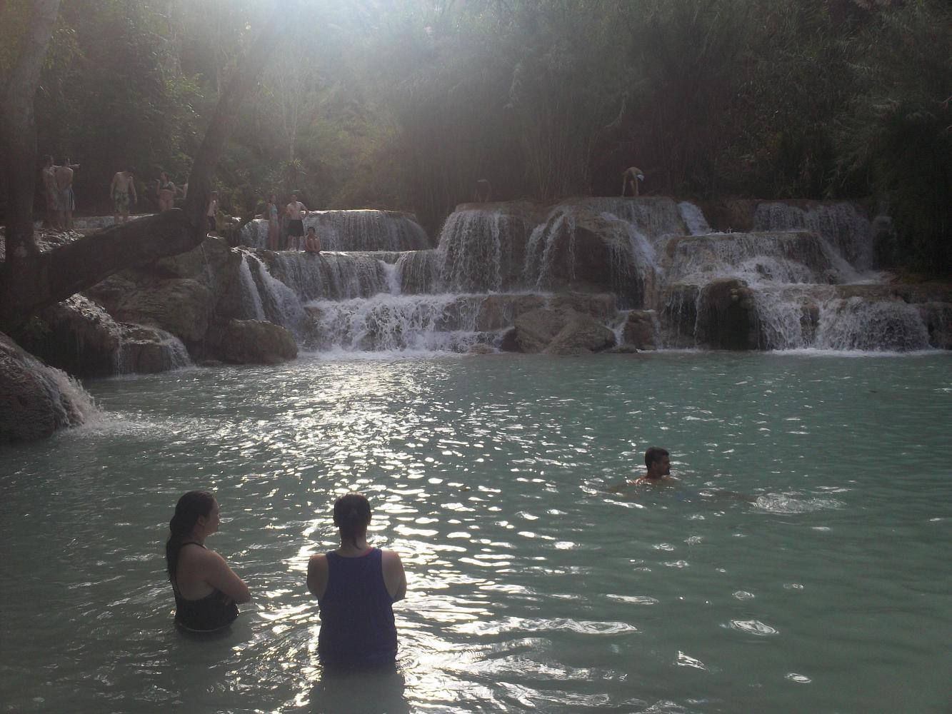 My first impression was that it didn't look real. It looked like a waterpark that had been artificially created. There was a big tiered waterfall at the far end of a big turquoise pool which had a few mangroves or bamboo or whatever growing in it here and there. The rock that the waterfall was made from was a biege colour that vaguely resembled plastic and it all seemed too perfect to have been created by chance. Yet what really made it look like a waterpark was all of the bikinis and bronzed bodies of young western tourists that stood on the waterfall like they were on spring break. Maybe they were on spring break. In December. I don't know. On the road we had seen almost nothing but tuk-tuks carrying tourists and, well, here they all were. It was the most we'd seen in one place, and there was no sign of any Laos people anywhere. But the location was impressive, and we jumped in to cool off all the same.