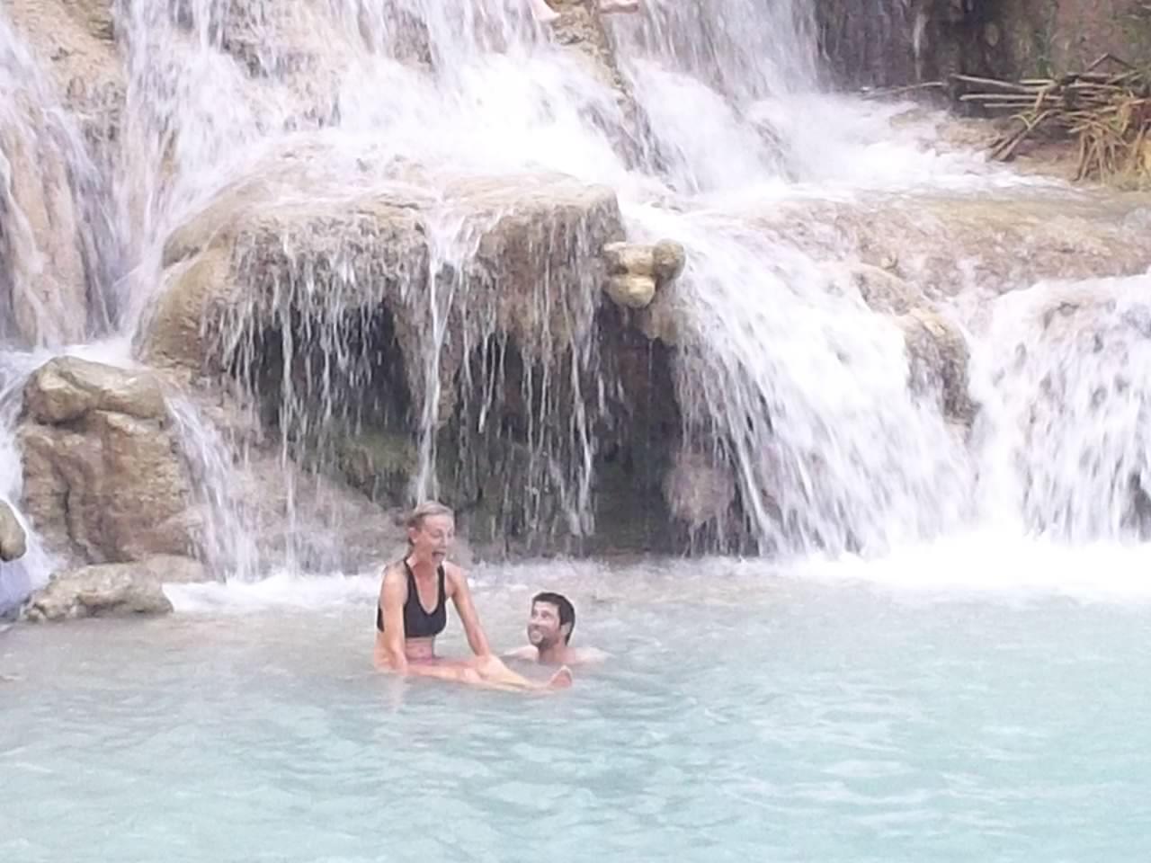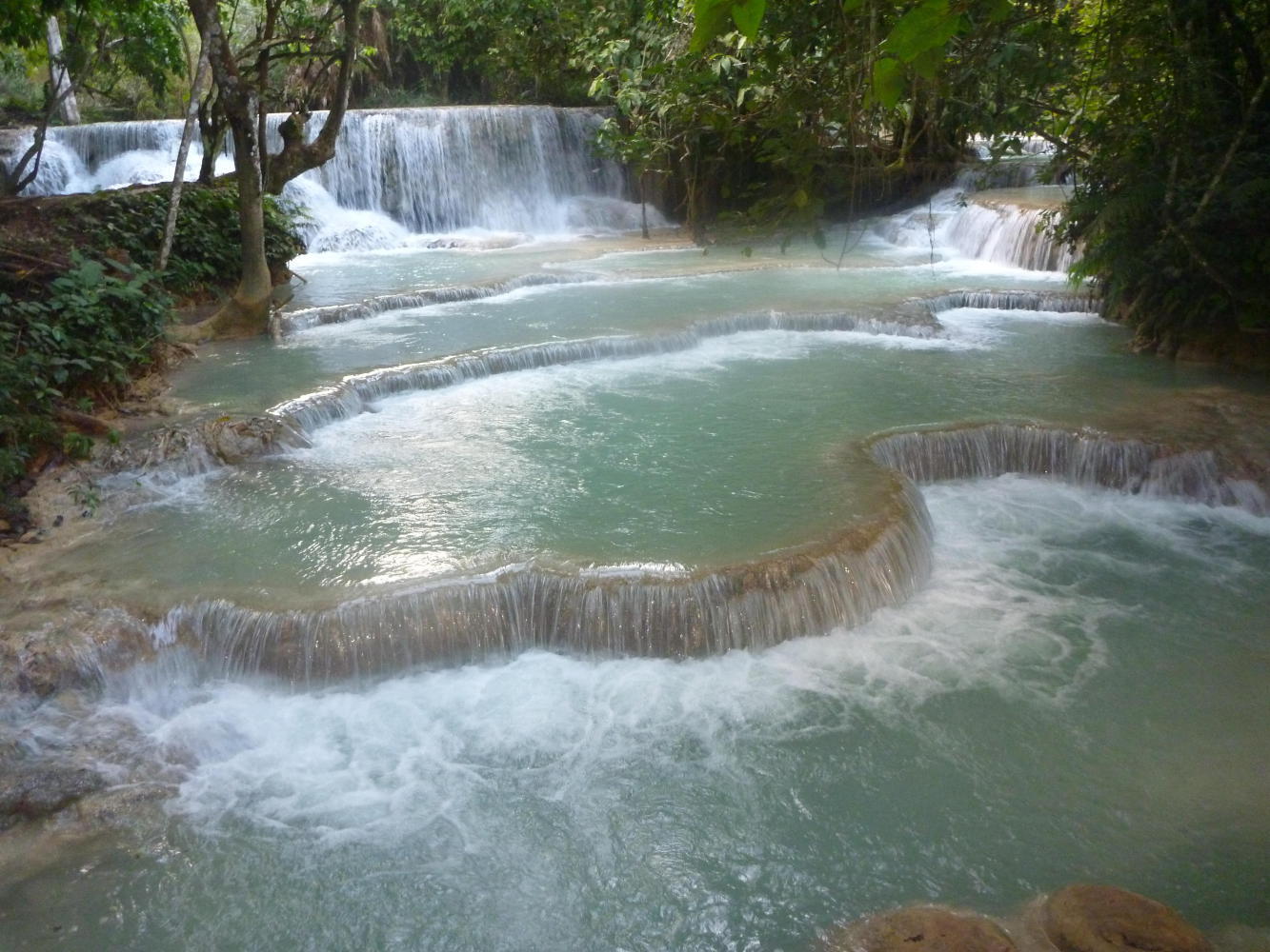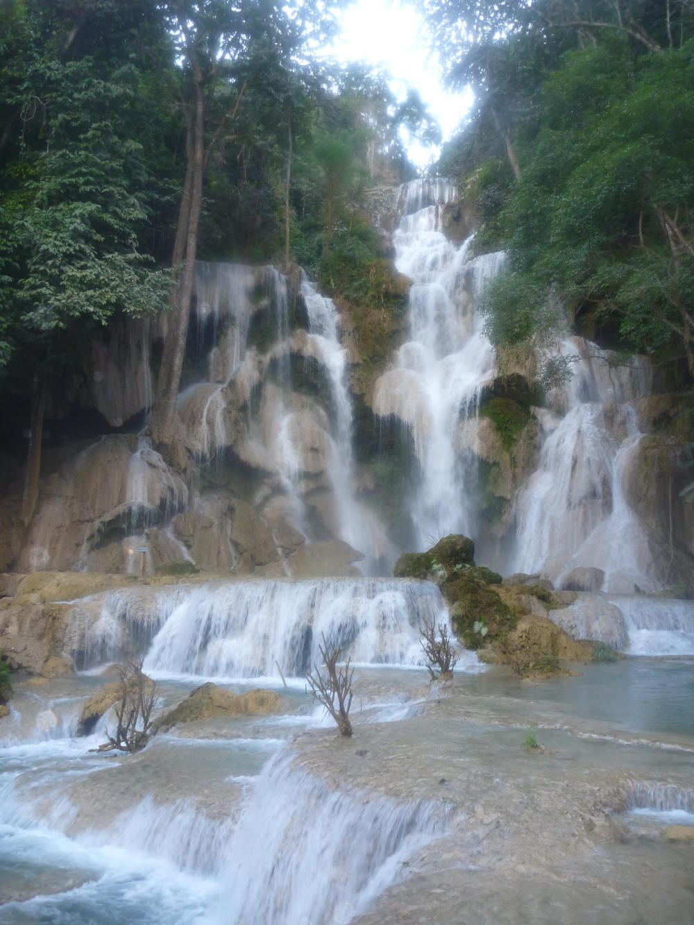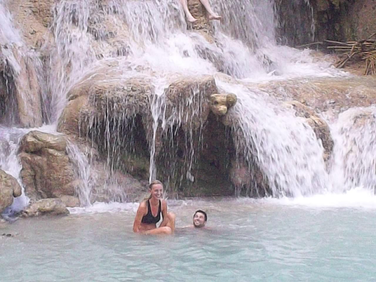 My first impression was that it didn't look real. It looked like a waterpark that had been artificially created. There was a big tiered waterfall at the far end of a big turquoise pool which had a few mangroves or bamboo or whatever growing in it here and there. The rock that the waterfall was made from was a biege colour that vaguely resembled plastic and it all seemed too perfect to have been created by chance. Yet what really made it look like a waterpark was all of the bikinis and bronzed bodies of young western tourists that stood on the waterfall like they were on spring break. Maybe they were on spring break. In December. I don't know. On the road we had seen almost nothing but tuk-tuks carrying tourists and, well, here they all were. It was the most we'd seen in one place, and there was no sign of any Laos people anywhere. But the location was impressive, and we jumped in to cool off all the same.