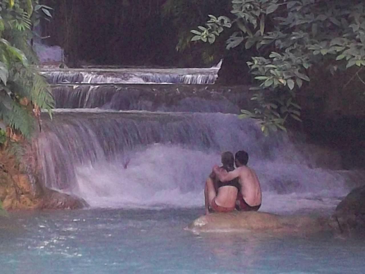 I swam over to a rock on the far side of the pool, which I climbed up onto. Beyond the rock was a whirlpool of white-water that was coming down from another big waterfall. From my position on the rock I could look through to this waterfall and see only the nature of the water and the forest around, without anyone else intruding. It was a beautiful view and I enjoyed a few moments alone looking at this and thinking serene and happy thoughts. Then Dea arrived and joined me on the rock and we sat and enjoyed a few moments together.