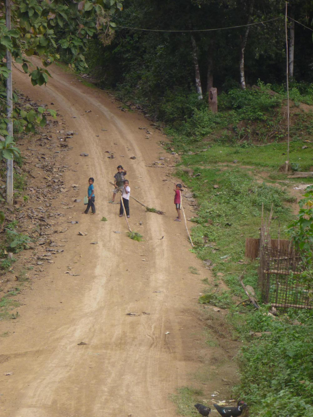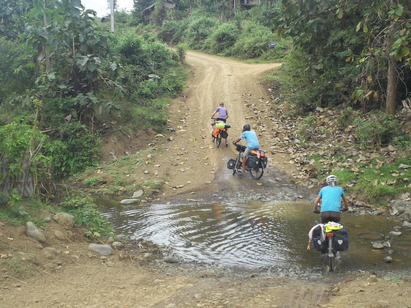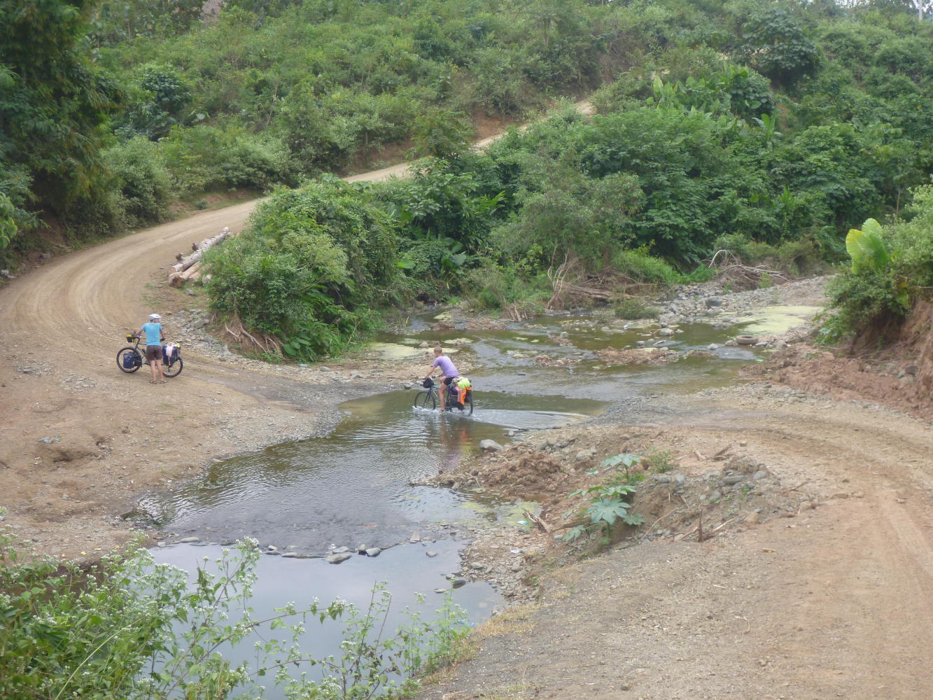 The road itself was a challenging one. Although it was vaguely following the Mekong it was not at all flat, and rose and fell constantly. Although most of these climbs were very short they were extremely steep and I think all of us resorted to pushing at some stage or another. Then there were the river crossings, a very great many of them, which were at least not too deep, although I shouldn't bother trying to cycle this road in the wet season. The rivers did at least provide some very nice swimming holes, which we took advantage of to cool off from the exhausting cycling. But for all the challenges this was unquestionably one great road, being as it was mostly free from traffic and passing through natural forest and occasionally those wonderful villages. Lacking in food we stopped in one such village to eat but there was no restaurant and so we lunched on pot noodles supplied from the local shop and ate them surrounded by curious children, no doubt surprised by the unusual appearance of us mysterious creatures from far away.