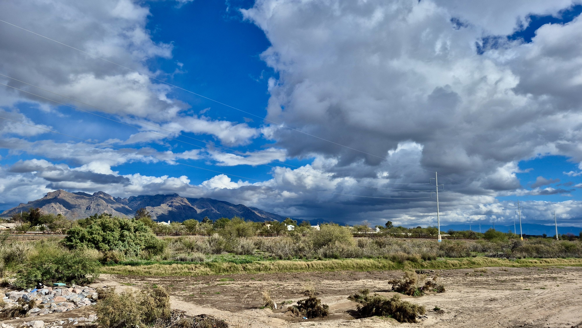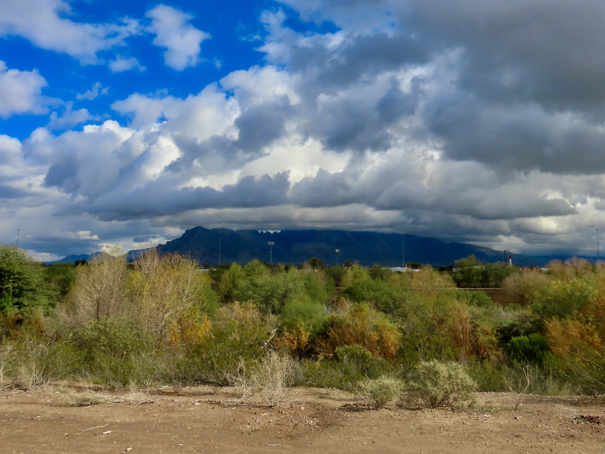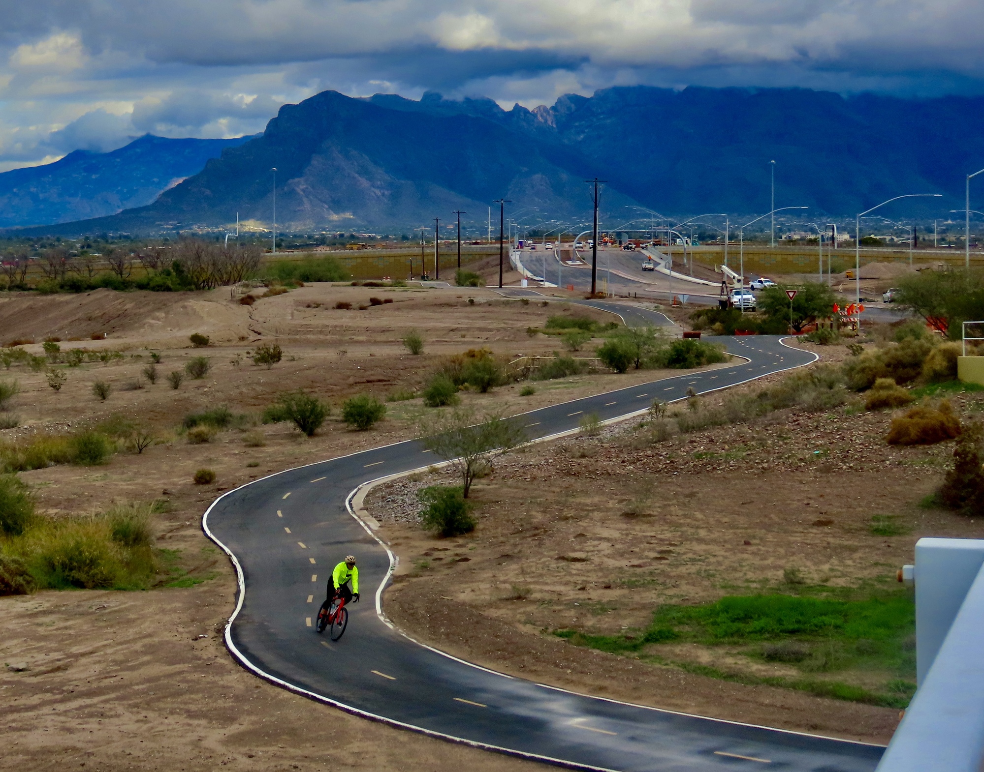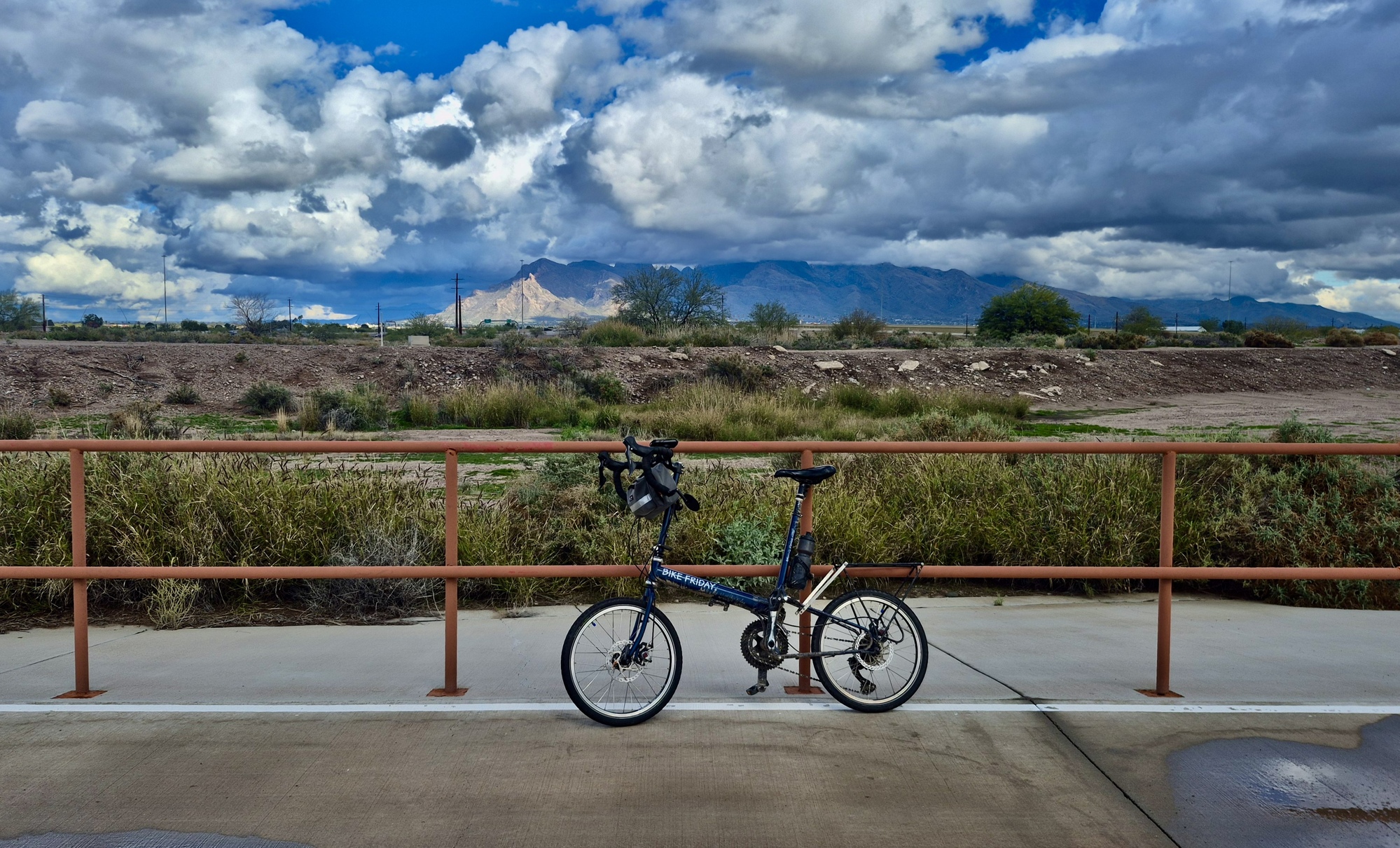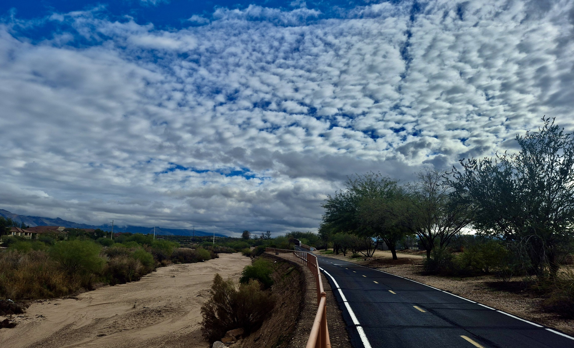 When I return to the loop I stop to take stock again by checking the weather app once more as well as the time, gauging whether I've got time to add a mile or two and swing by Sweetwater on the other side of the wash and get home before the rains arrive again and without being late for dinner. It looks like I should be fine as long as I keep a reasonable pace, so I head south to the new bridge across the wash and turn north toward Sweetwater and eventually home.
