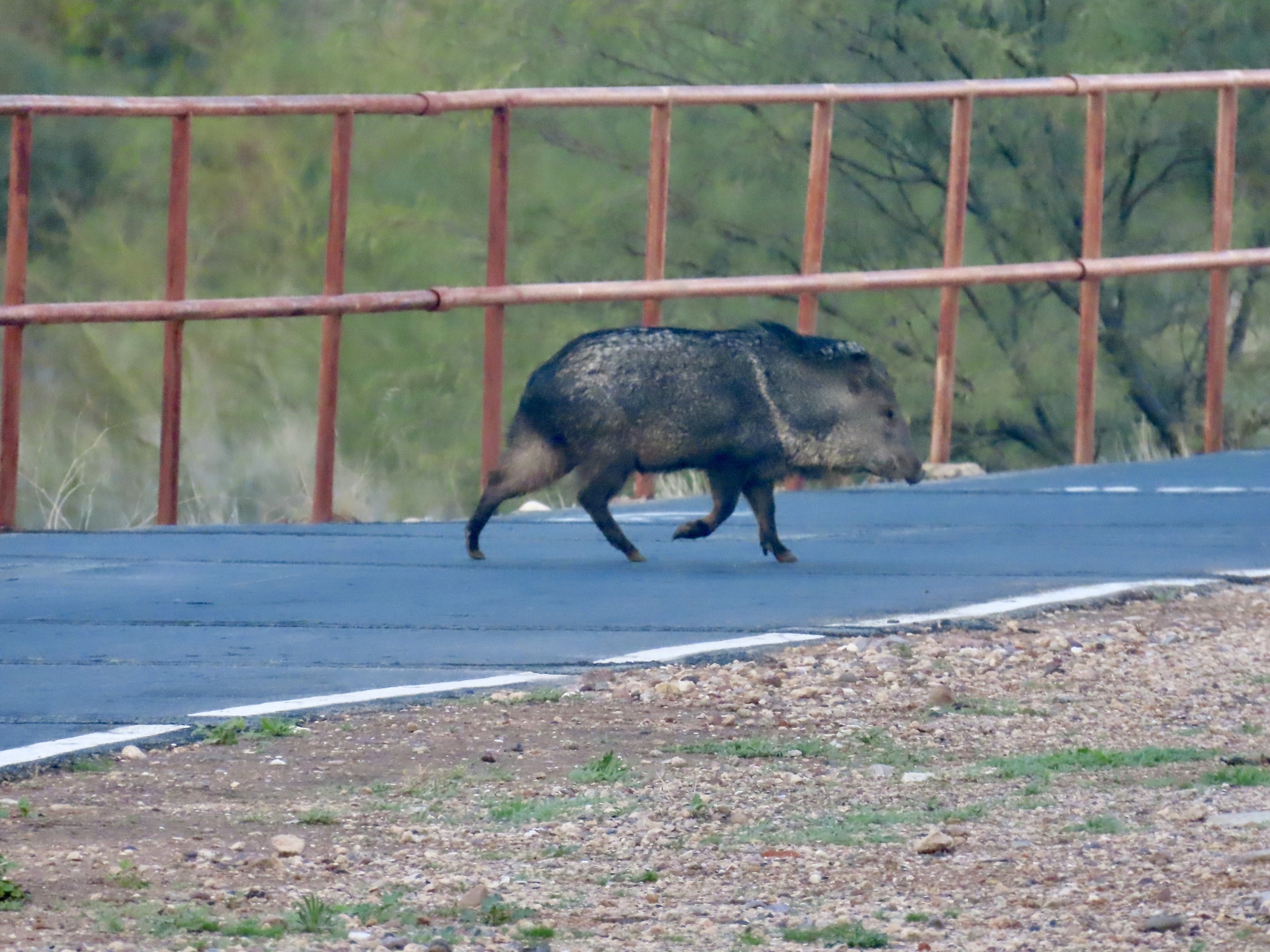 The real prize for the day, and one that makes the entire outing worthwhile, comes a half mile later when I look ahead and see a lone javelina cross the path maybe a hundred yards away before dropping into the wash. I stop immediately, reach for the phone as my quickest instrument on the draw, but the best I can get is a small, dark profile just disappearing into the brush below. Disappointing, but it's still a thrill just to see one, the first of the year for either of us.
